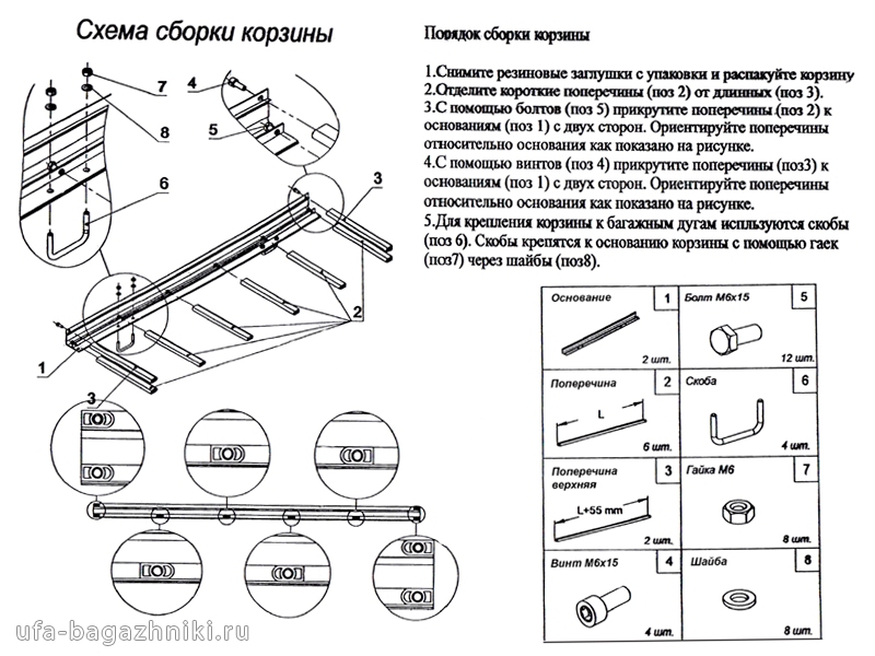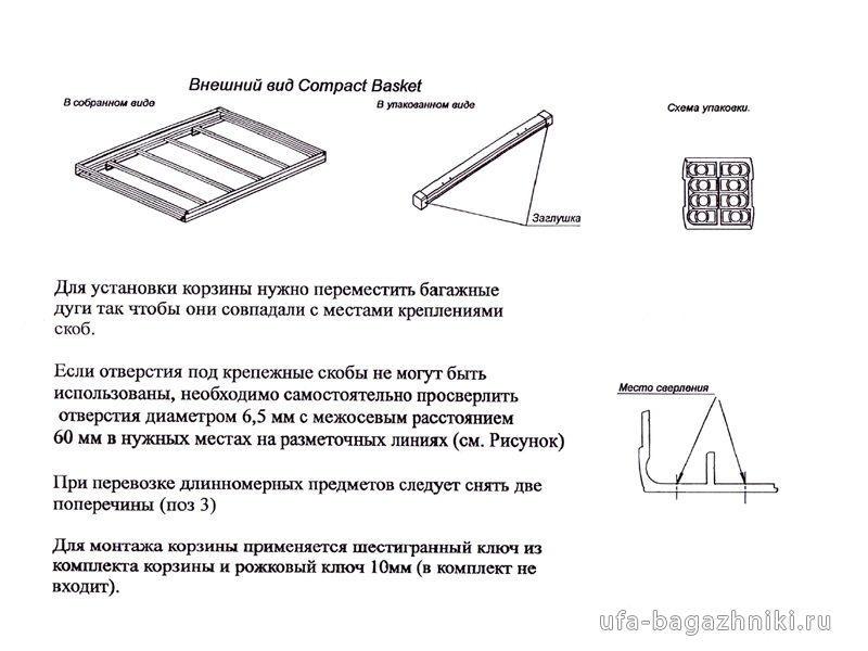 Комплект представляет сборно-разборную конструкцию и при необходимости собирается в компактный тубус сечением 7х7 см, который удобно хранить в домашних условиях. Сборка и монтаж корзины производится согласно прилагаемой инструкции и занимает 15-20 минут. Купить грузовую корзину "Атлант" вы можете в нашем интернет-магазине "Уфа-багажники". Доставка по Уфе и России.