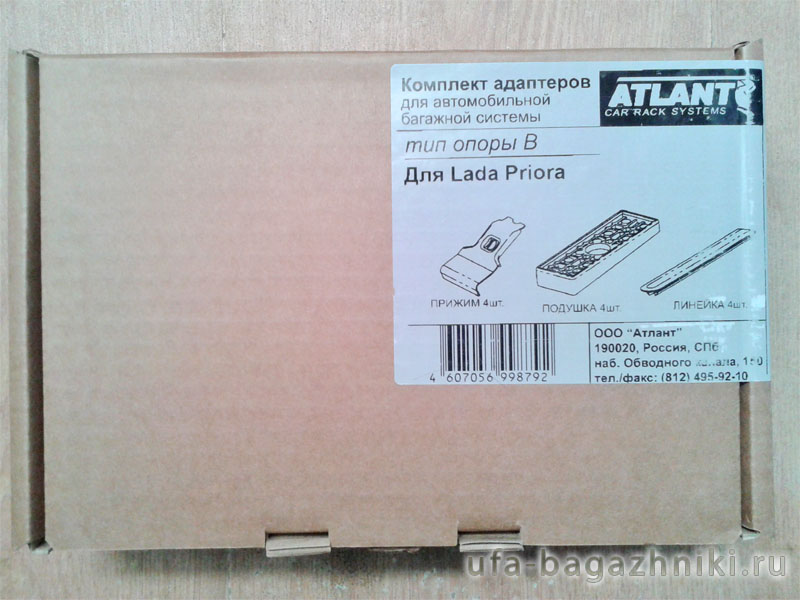Комплект адаптеров Лада Приора – это набор специально спроектированных крепёжных кронштейнов, резинотехнических изделий, болтов, шайб и т.п., с помощью которых опоры фиксируются на крыше. Крепёжные кронштейны (прижимы) изготавливаются из конструкционной стали и покрываются слоем полиуретана, предохраняющего лакокрасочное покрытие кузова от повреждений при установке и эксплуатации. Комплект адаптеров включает инструкцию по сборке.
