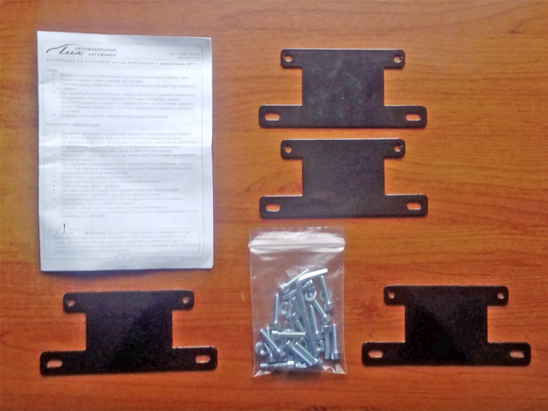 Комплект адаптеров Ford Explorer V, 2017-... – это набор специально спроектированных крепёжных кронштейнов, резинотехнических изделий, болтов, шайб и т.п., с помощью которых опоры фиксируются на крыше (на интегрированных рейлингах). Крепёжные кронштейны (прижимы) изготавливаются из конструкционной стали и покрываются слоем полиуретана, предохраняющего рейлинг от повреждений при установке и эксплуатации.