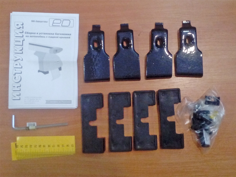 Комплект адаптеров Kia Rio 2011-17 – это набор специально спроектированных крепёжных кронштейнов, резинотехнических изделий, болтов, шайб и т.п., с помощью которых опоры фиксируются на крыше. Крепёжные кронштейны (прижимы) изготавливаются из конструкционной стали и покрываются слоем полиуретана, предохраняющего лакокрасочное покрытие кузова от повреждений при установке и эксплуатации. Комплект адаптеров включает инструкцию по сборке.