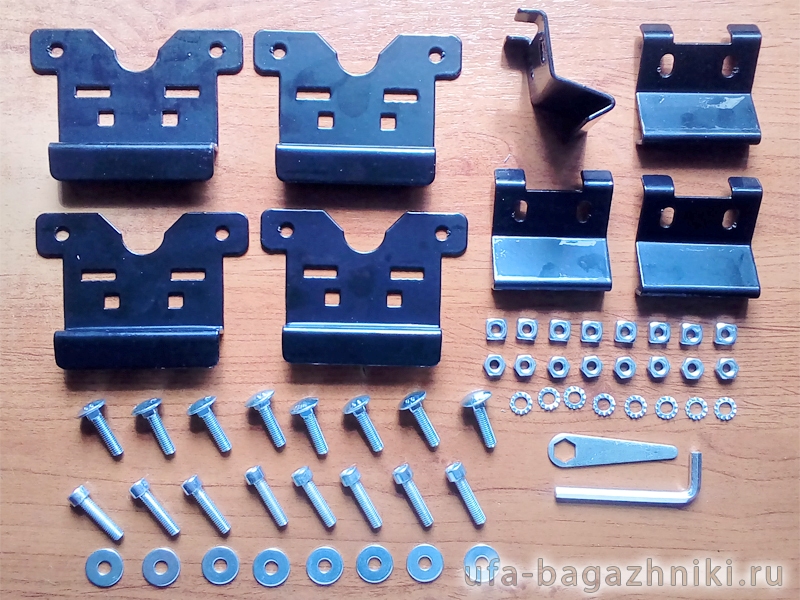 Комплект адаптеров Lifan Myway 2016-... – это набор специально спроектированных крепёжных кронштейнов, резинотехнических изделий, болтов, шайб и т.п., с помощью которых опоры фиксируются на крыше (на интегрированных рейлингах). Крепёжные кронштейны (прижимы) изготавливаются из конструкционной стали и покрываются слоем полиуретана, предохраняющего рейлинг от повреждений при установке и эксплуатации.