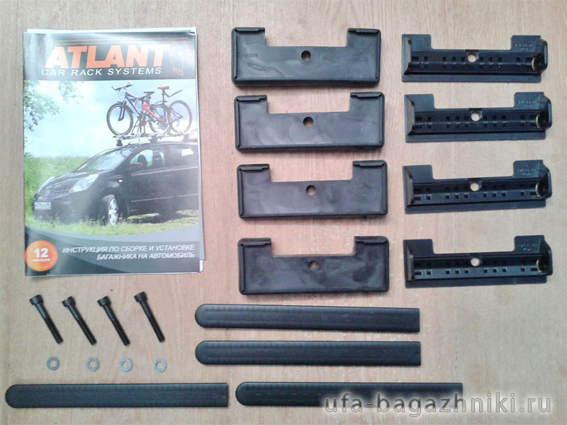 Комплект адаптеров Mazda– это набор специально спроектированных крепёжных кронштейнов, резинотехнических изделий, болтов, шайб и т.п., с помощью которых опоры фиксируются на крыше. Крепёжные кронштейны (прижимы) изготавливаются из конструкционной стали и покрываются слоем полиуретана, предохраняющего лакокрасочное покрытие кузова от повреждений при установке и эксплуатации. Комплект адаптеров включает инструкцию по сборке.