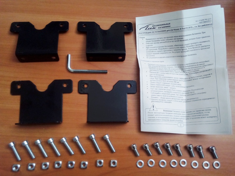 Комплект адаптеров Nissan X-Trail T32, 2013-... – это набор специально спроектированных крепёжных кронштейнов, резинотехнических изделий, болтов, шайб и т.п., с помощью которых опоры фиксируются на крыше (в штатные места). Крепёжные кронштейны (прижимы) изготавливаются из конструкционной стали и покрываются слоем полиуретана, предохраняющего крышу от повреждений при установке и эксплуатации.