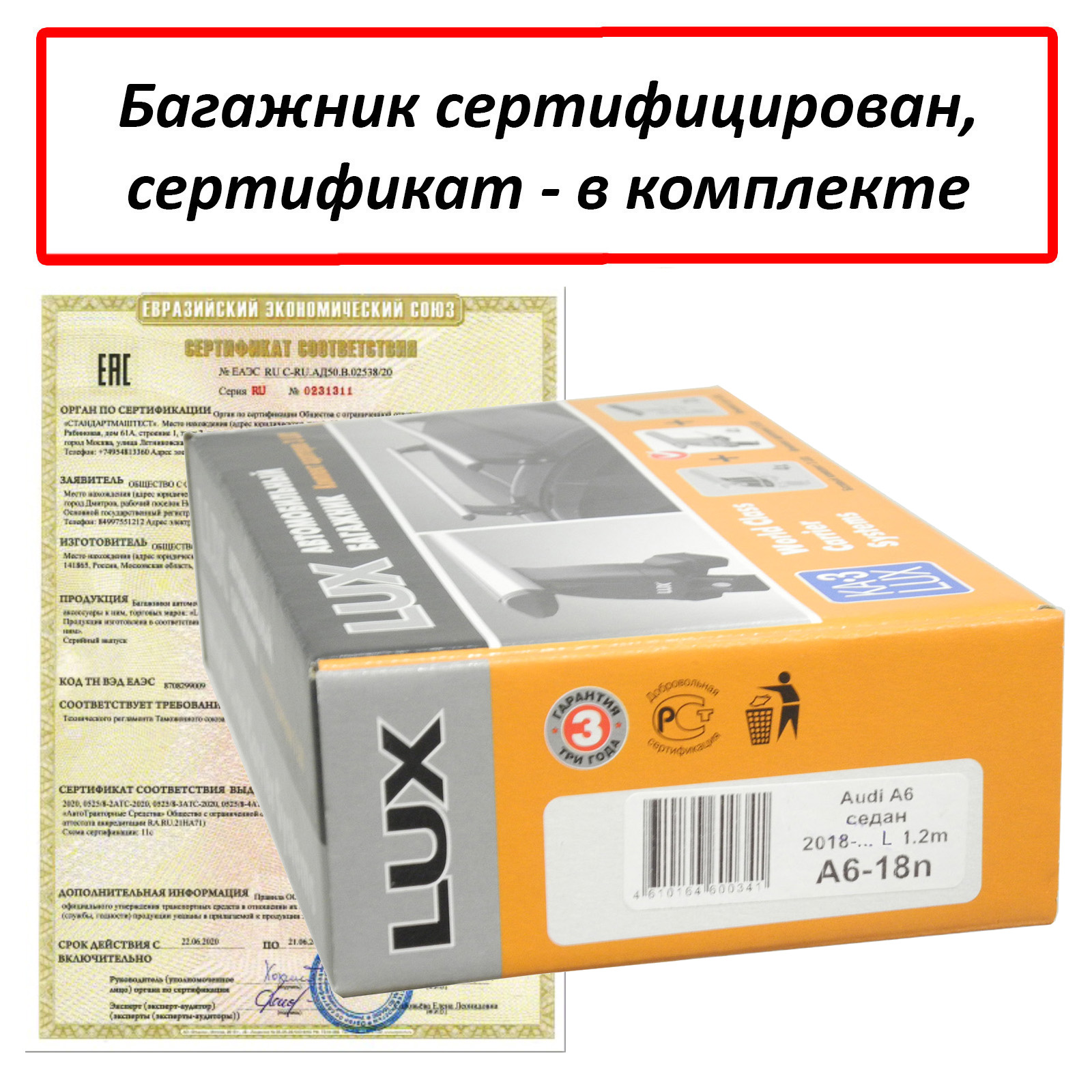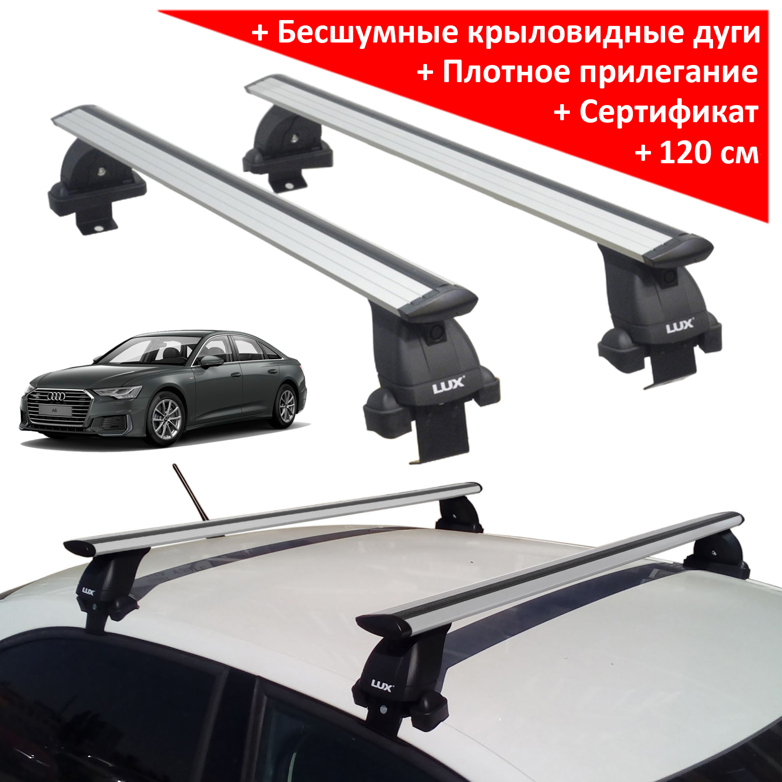 Автобагажник на крышу автомобиля Audi A6 (C8)(sedan, 2018-...) - Lux (Россия), крыловидные дуги (аэро-трэвэл 82 мм). Грузоподъемность до 75 кг