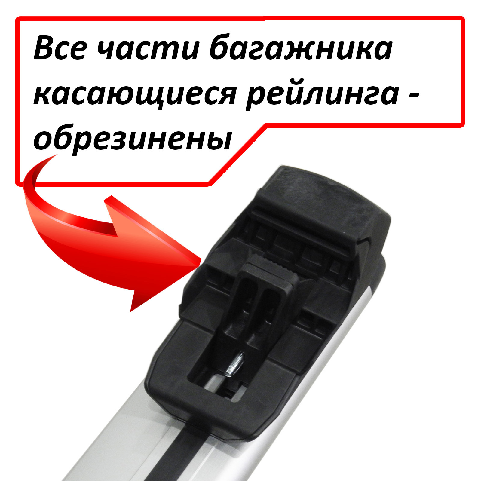 В комплект представленной багажной системы входят 2 поперечины и четыре крепления на рейлинги. Поперечные дуги изготовлены из алюминия, имеют крыловидный профиль - специально разработанный для наиболее низкого сопротивления на скорости. Длина  дуг - 1250 мм (также есть варианты 1100 мм и 1350 мм), сверху дуг проходит Т-профиль, предназначенный для установки дополнительного оборудования - велокреплений, лыжных насадок, фиксаторов груза и т.д. Концы дуг закрываются пластиковыми заглушками.