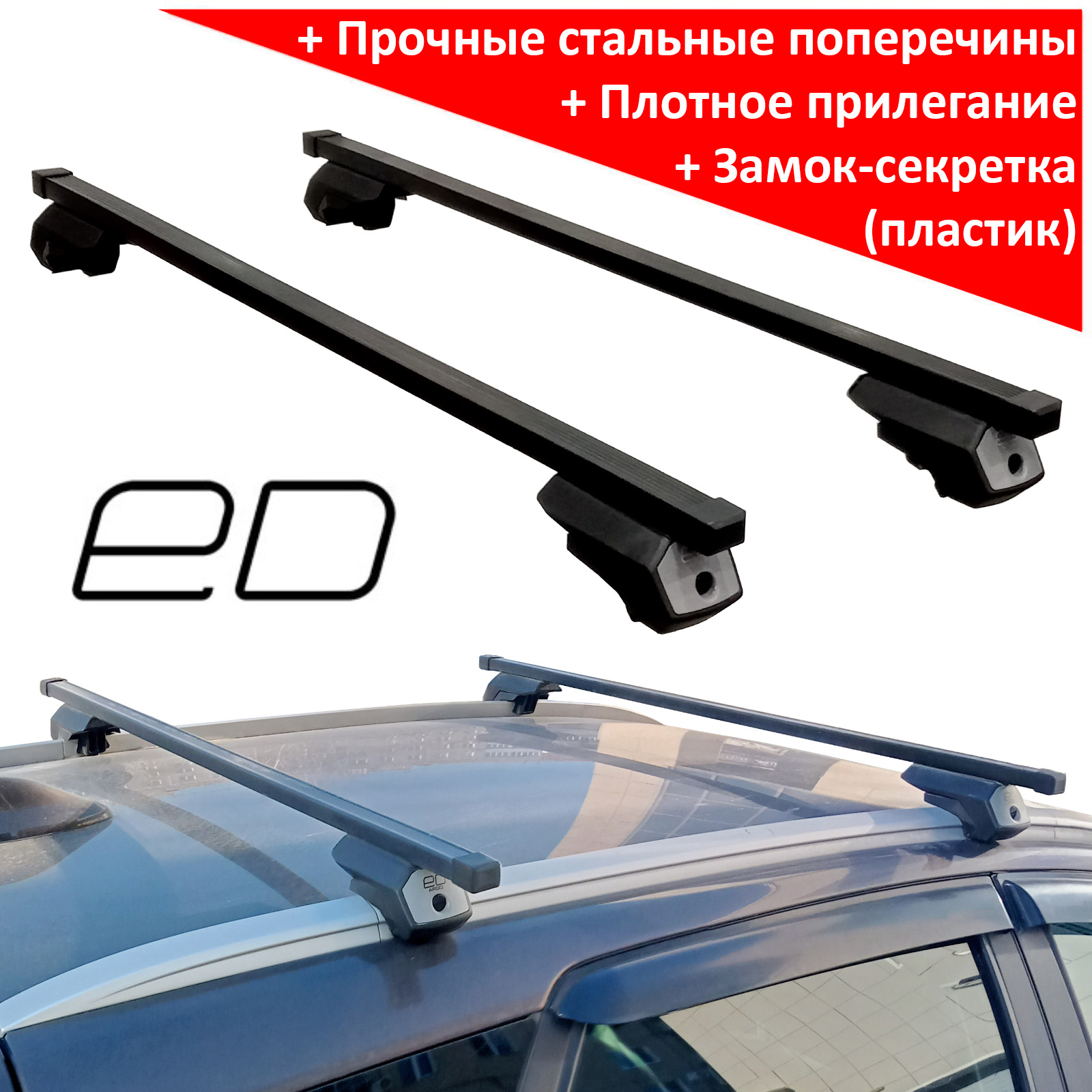 В комплект представленной багажной системы входят 2 поперечины и четыре крепления на рейлинги. Поперечные дуги изготовлены из стального прямоугольного профиля длиной 125 см (также есть варианты 110 /135 см). Каждая дуга имеет жесткую пластиковую оболочку черного цвета, с рельефной поверхностью с верхней стороны. Концы дуг закрываются пластиковыми заглушками.