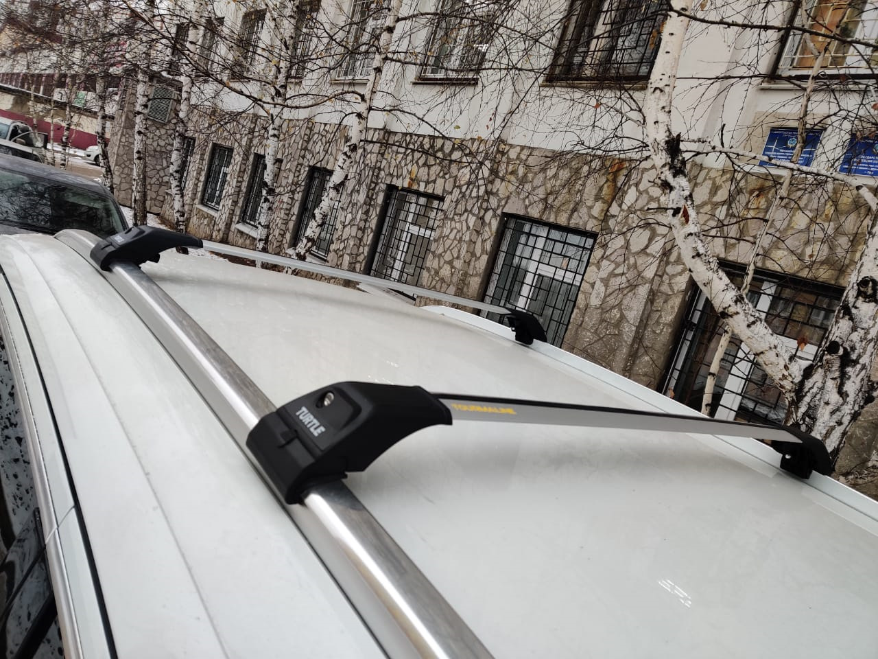 Багажник на интегрированные рейлинги Turtle Tourmaline V2 (Турция), без вылетов, с крыловидными дугами серебристого цвета. Грузоподъемность - до 75 кг.