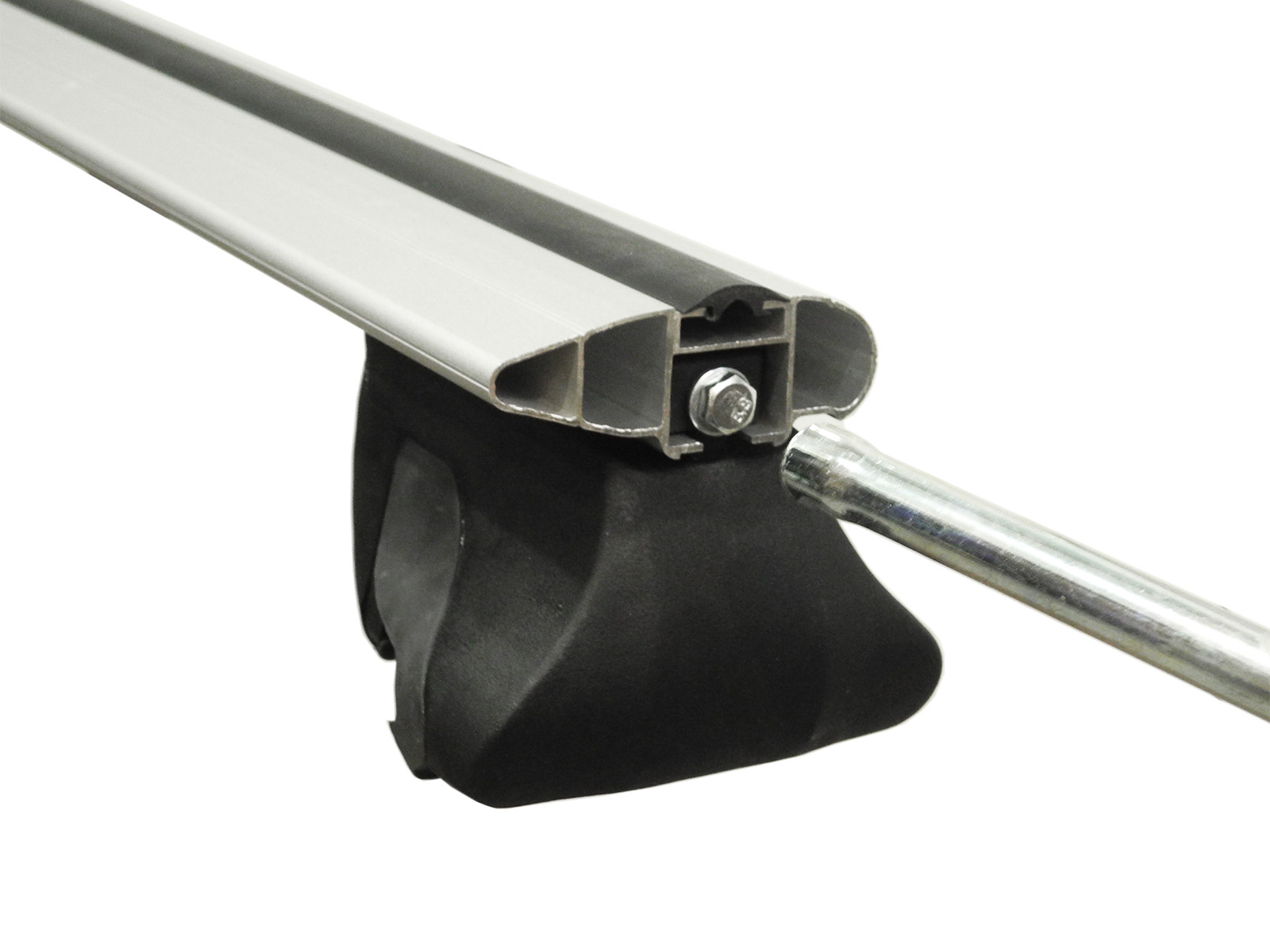 В комплект представленной багажной системы входят 2 поперечины и четыре крепления на рейлинги. Поперечные дуги изготовлены из алюминия, имеют крыловидный профиль шириной 80 мм, их длина - 1200 мм, сверху дуг проходит Т-профиль, предназначенный для установки дополнительного оборудования - велокреплений, лыжных насадок, фиксаторов груза и т.д. Концы дуг закрываются пластиковыми заглушками.