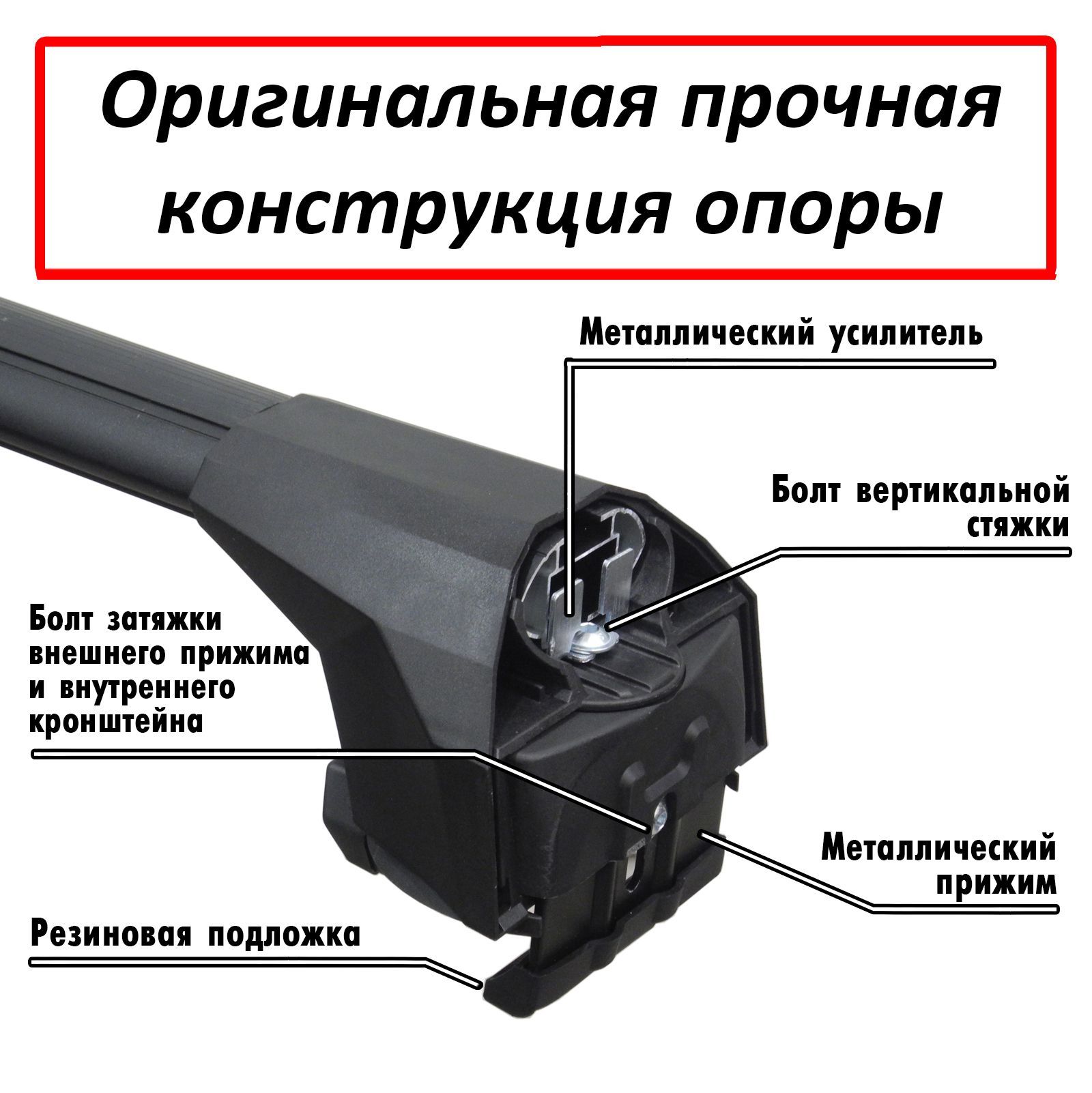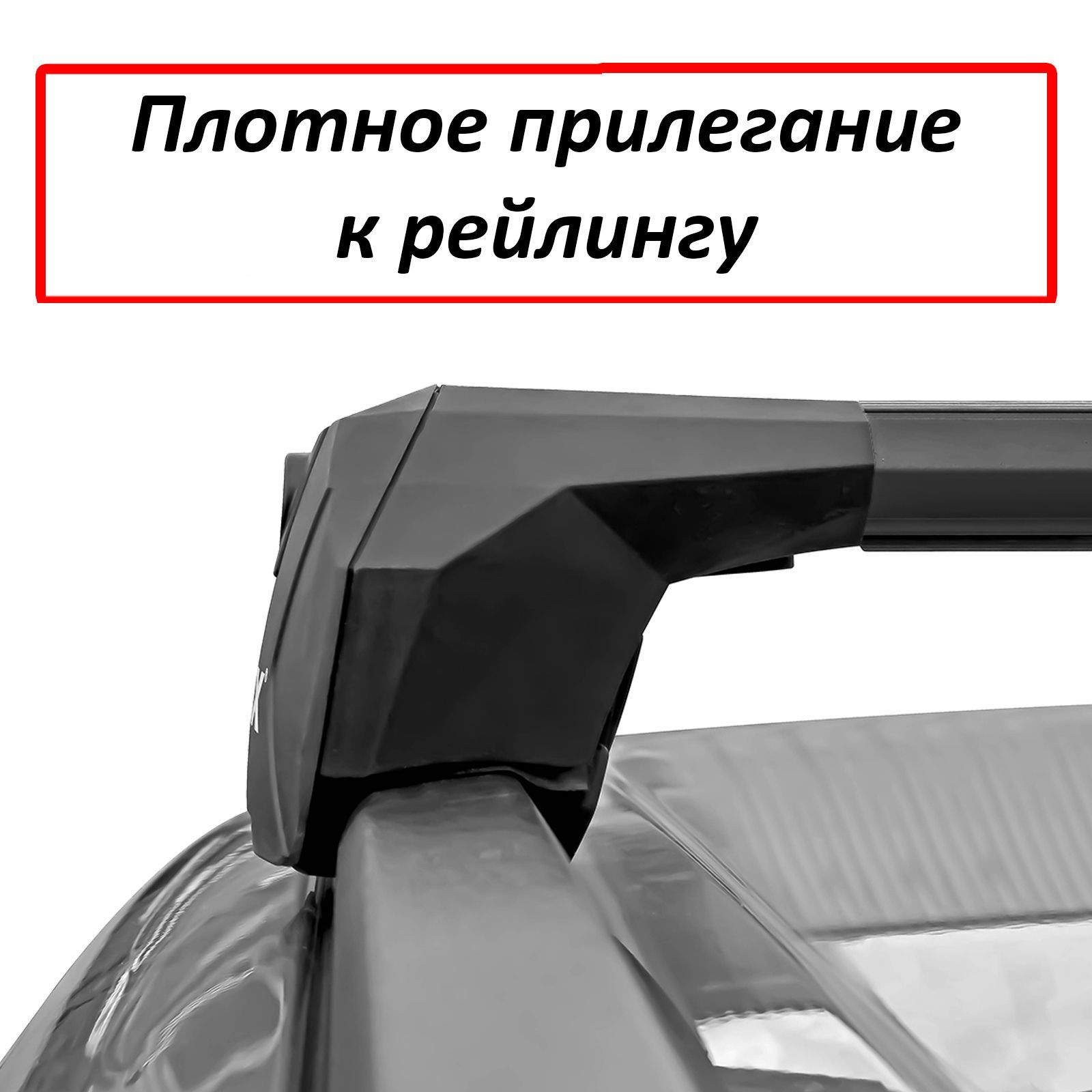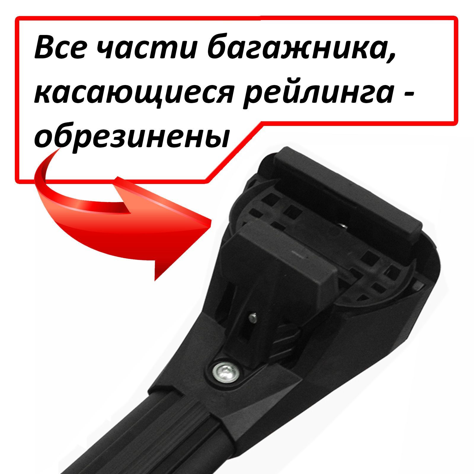 Данный багажник является универсальным, но благодаря множеству настроек (высота заднего прижима, возможность подбора подходящей накладки под задний кронштейн), - багажник максимально прочно и надежно обхватывает рейлинг, как с внутренней и внешней стороны, так и сверху. Все части багажника, соприкасающиеся с рейлингом, имеют резиновое покрытие.