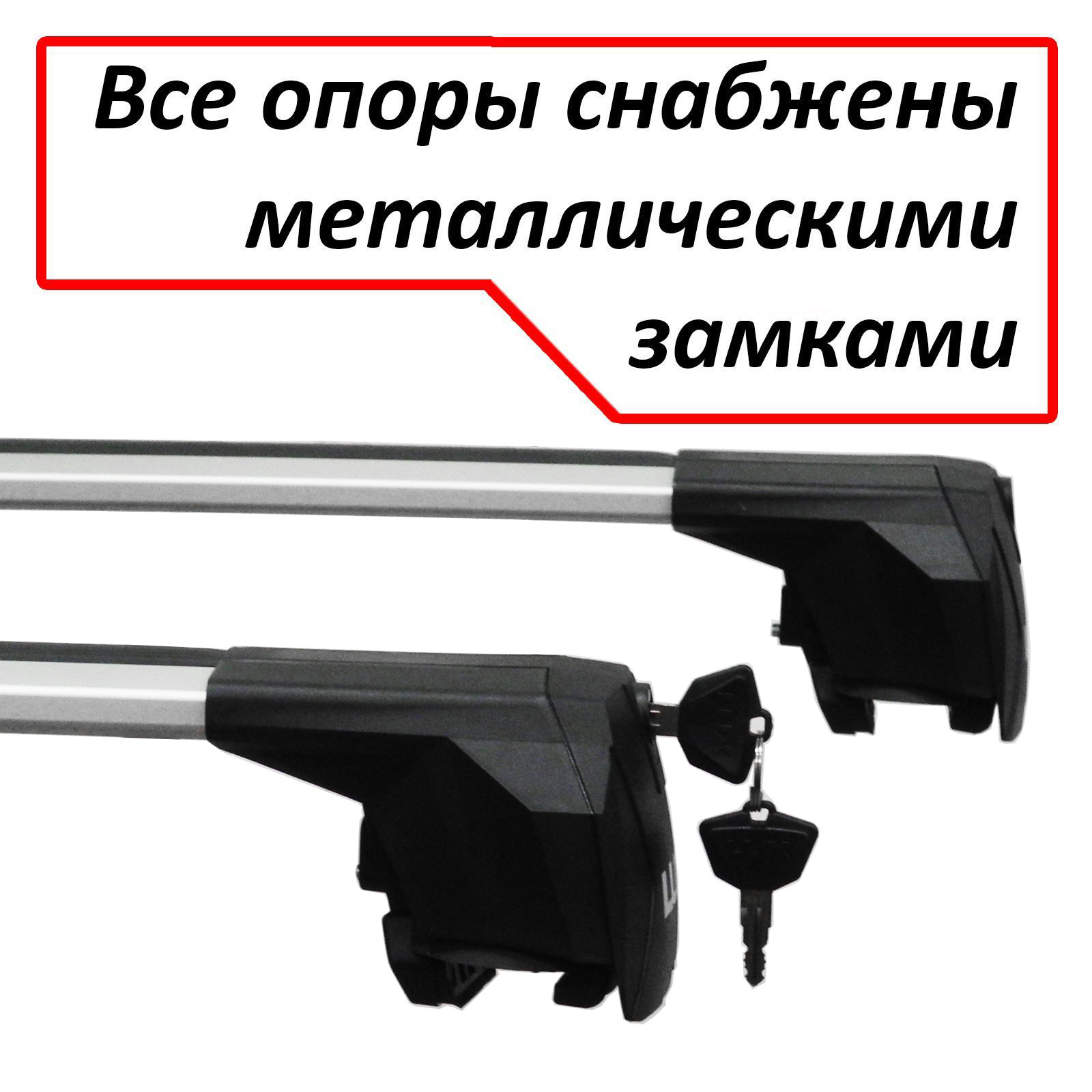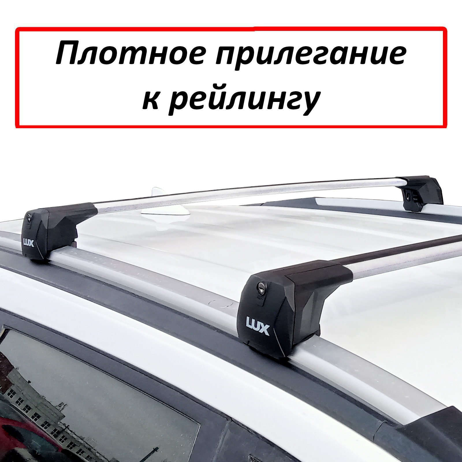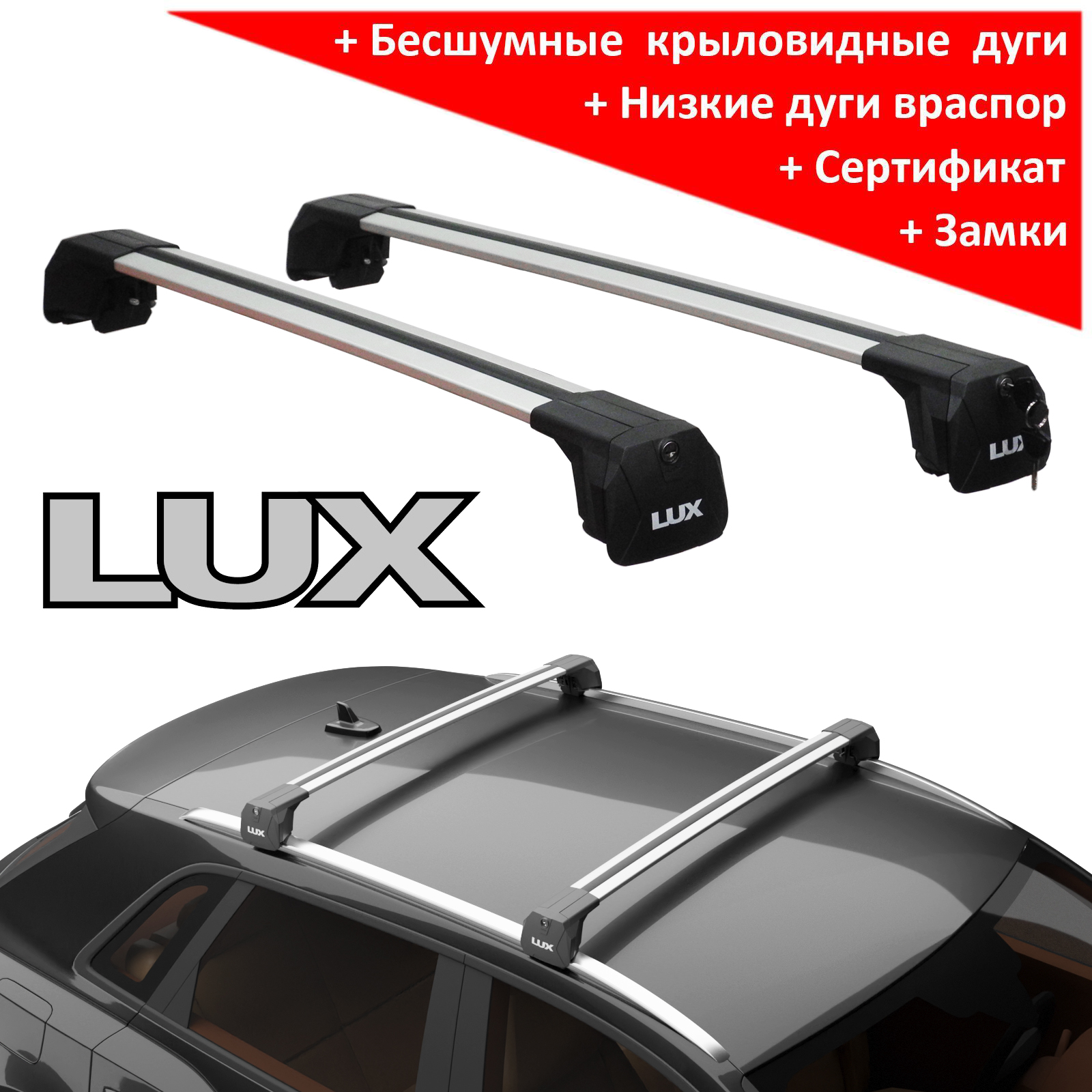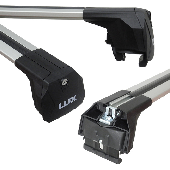 Багажник на интегрированные рейлинги Lux Scout 2 (враспор, без вылетов), серебристые крыловидные дуги, с замком. Нагрузка до 85 кг.