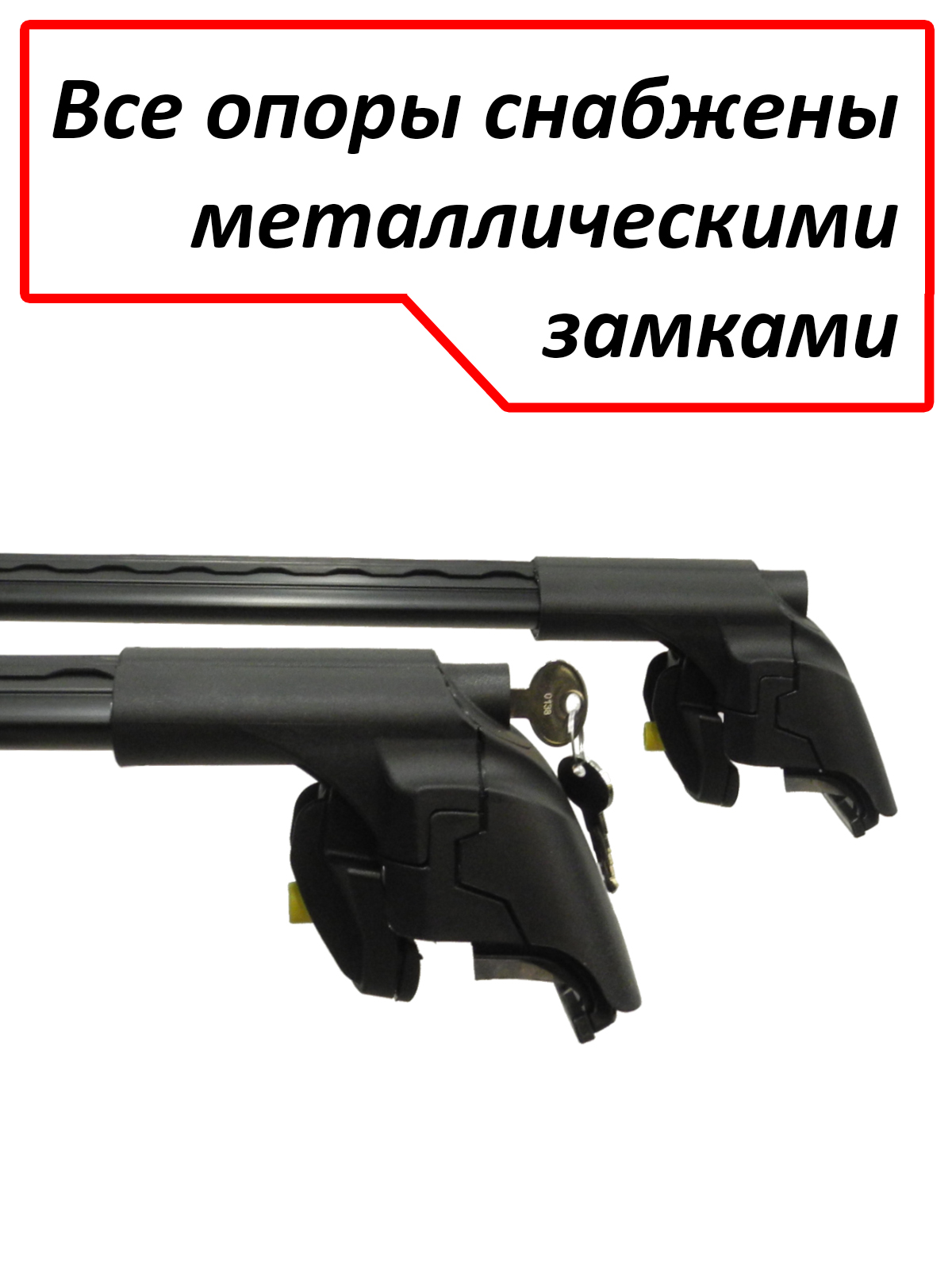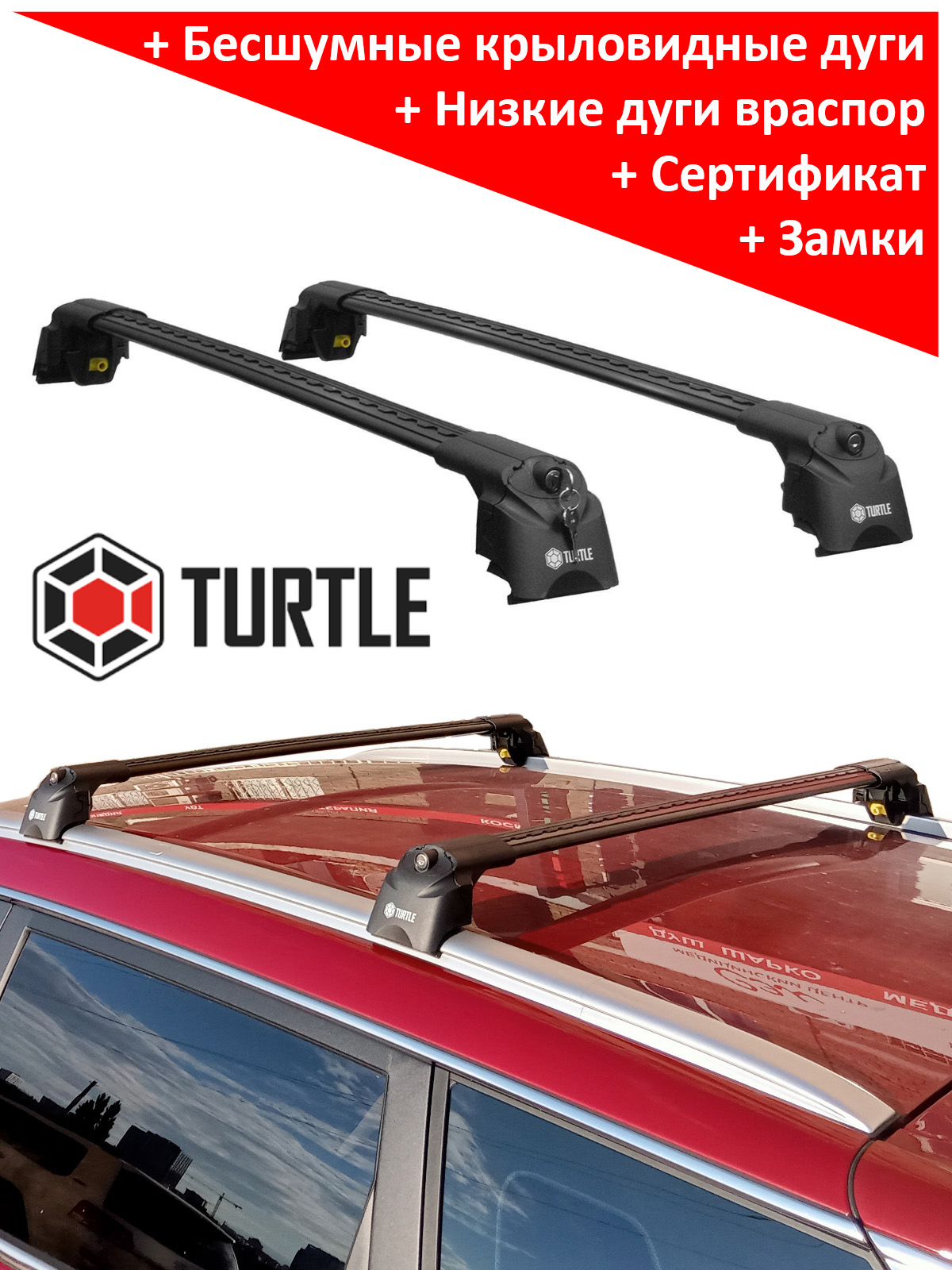 Универсальный багажник на интегрированные рейлинги Turtle Air 2 (Турция), без вылетов, с аэродинамическими дугами черного цвета. Грузоподъемность - до 75 кг.