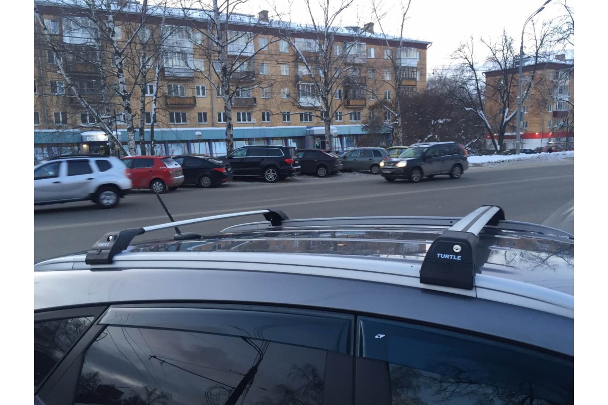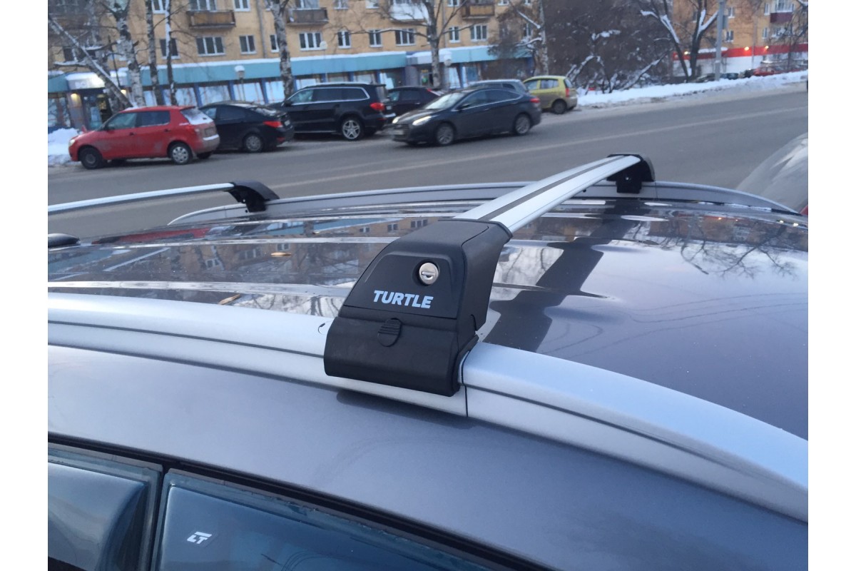 Багажник на интегрированные рейлинги Turtle Tourmaline V2 (Турция), без вылетов, с крыловидными дугами серебристого цвета. Грузоподъемность - до 75 кг.