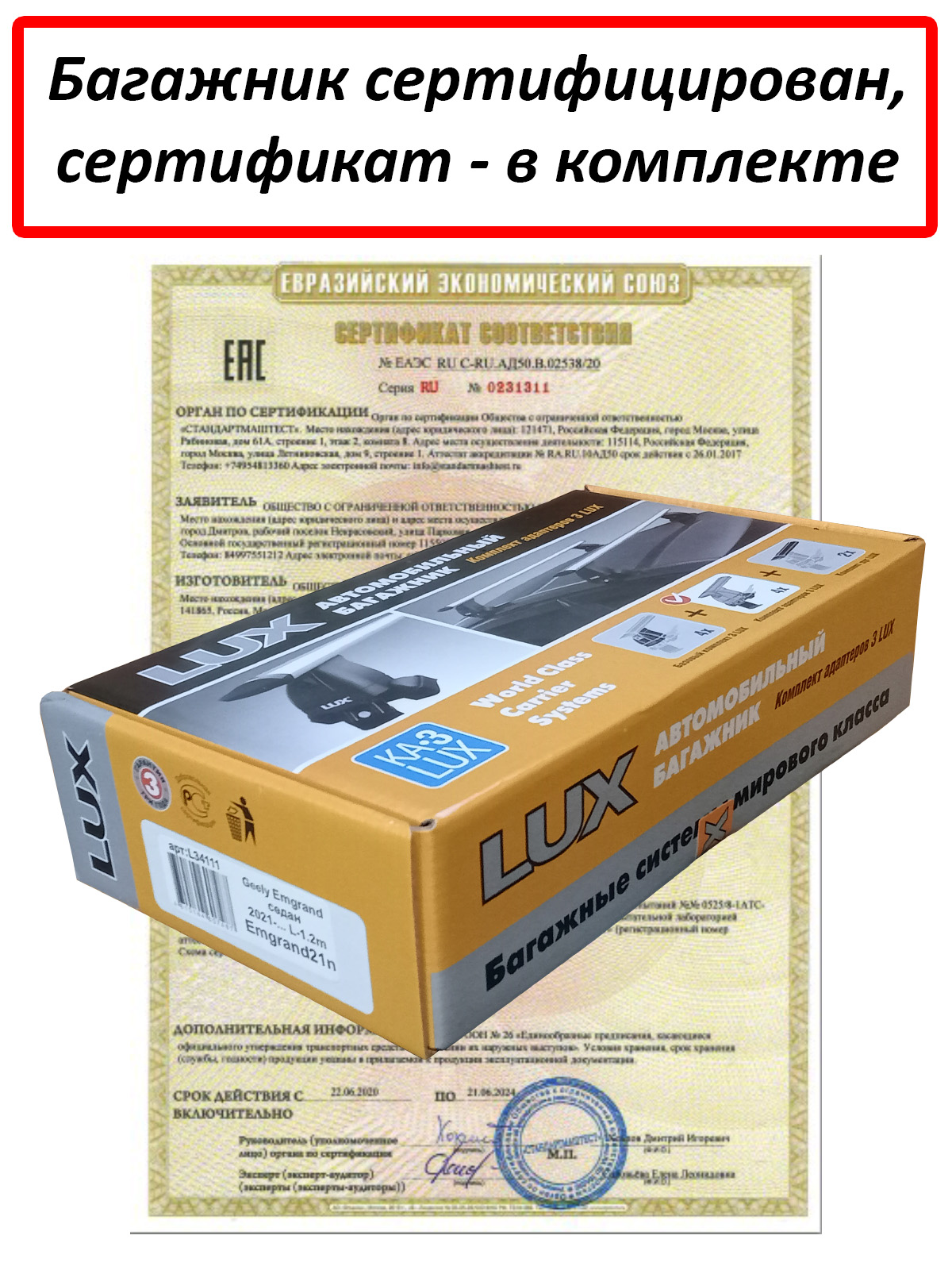 Автобагажник на крышу автомобиля Geely Emgrand (седан, 2021-...) - Lux (Россия), крыловидные дуги черного цвета (аэро-трэвэл 82 мм). Грузоподъемность до 75 кг