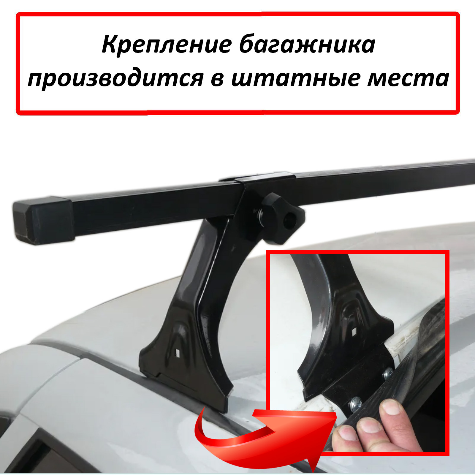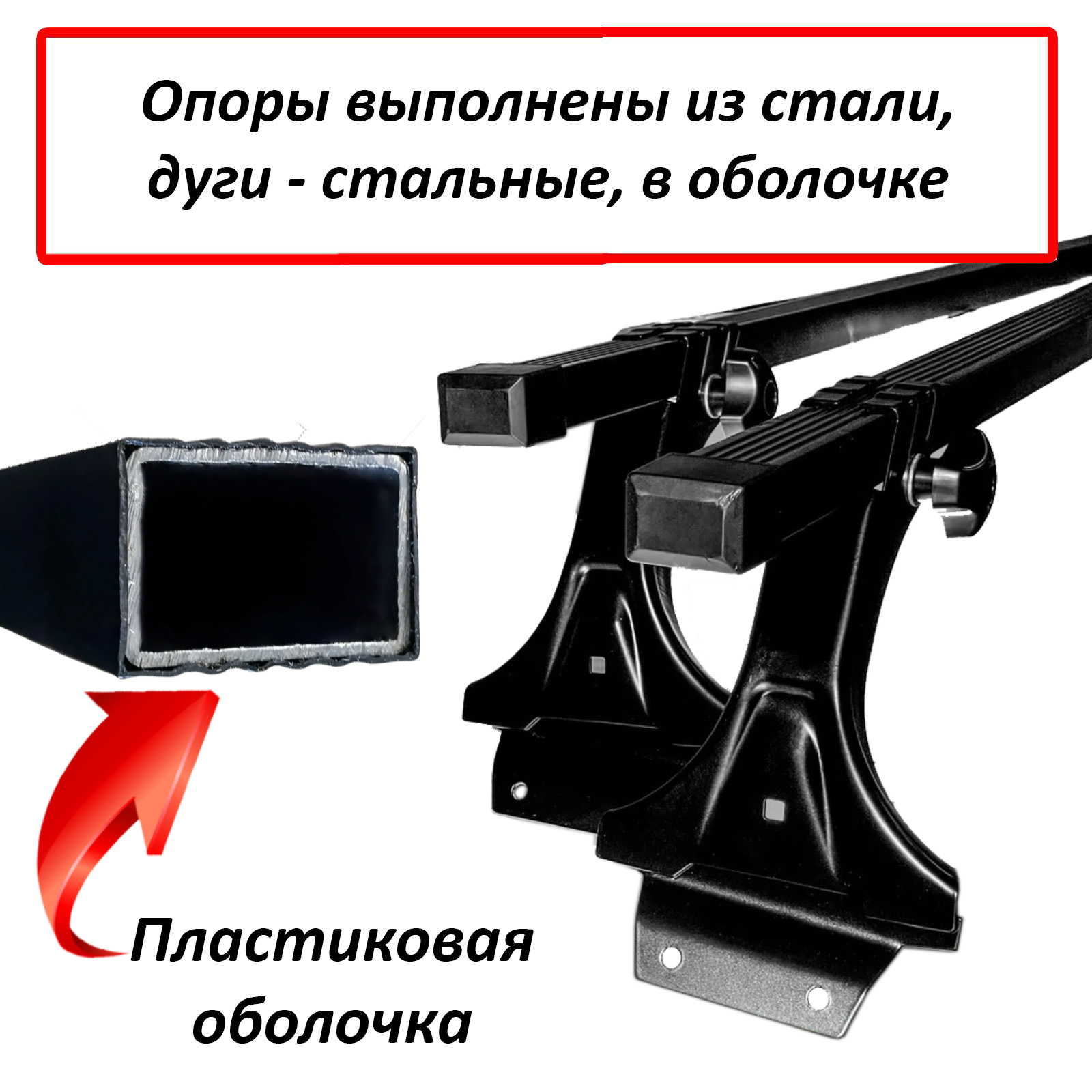 Основой багажника являются 2 поперечные дуги прямоугольного сечения, изготовленные из стального профиля, длиной 115 см. Каждая дуга имеет защитную рельефную оболочку черного цвета, концы закрываются пластиковыми заглушками. Дуги крепятся на систему стальных опор посредством винтов с барашками. Фиксация на крыше производится в штатные отверстия, расположенные под уплотнительной резинкой вдоль дверей с помощью болтов в комплекте.