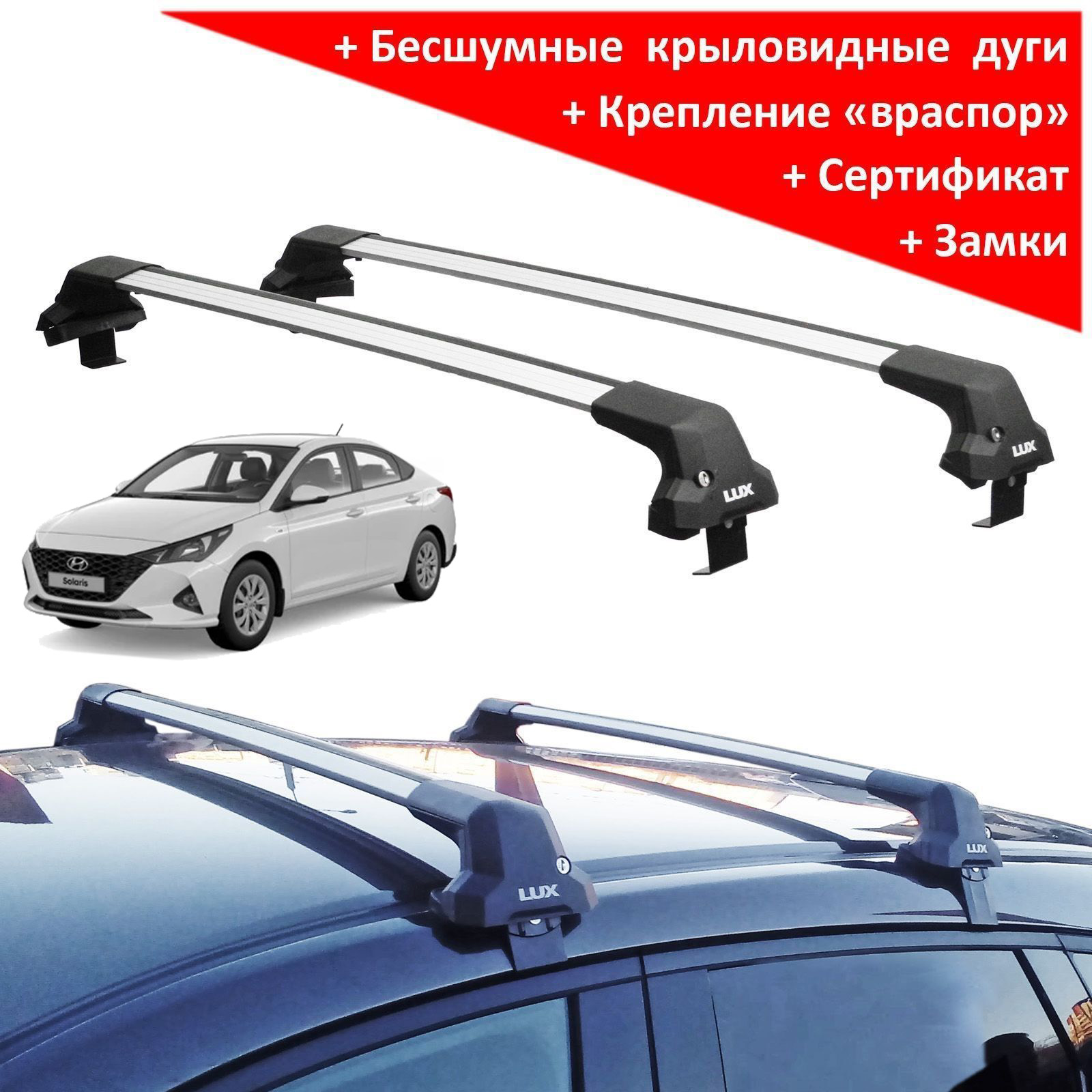 Представляем багажную систему Lux City на крышу Hyundai Solaris (sedan, 2017-...) от российского производителя - марки "Lux". Цвет дуг - серебристый.