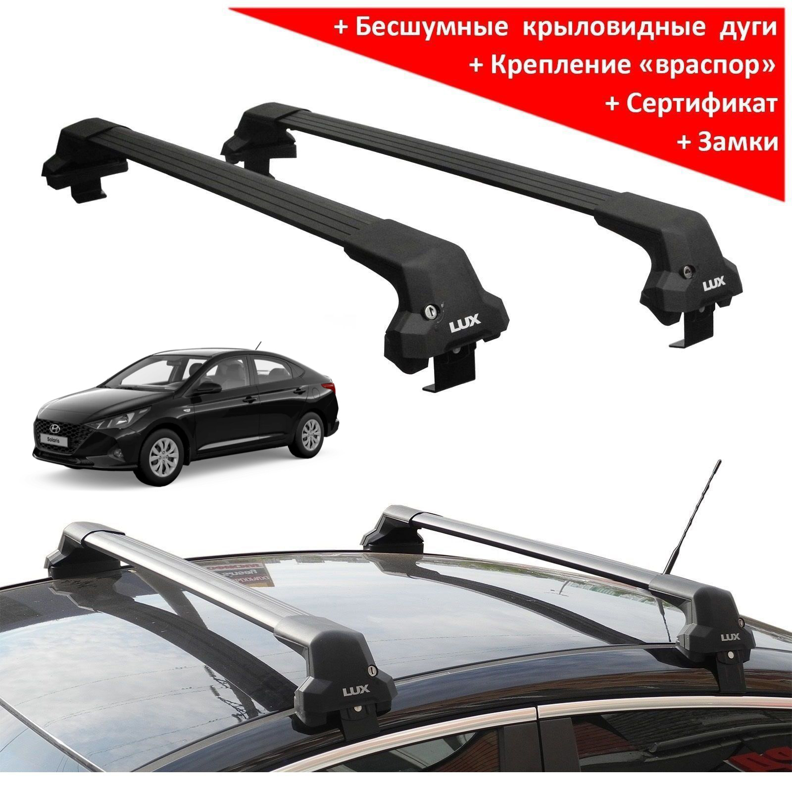 Представляем багажную систему Lux City на крышу Hyundai Solaris (sedan, 2017-...) от российского производителя - марки "Lux". Цвет дуг - черный.