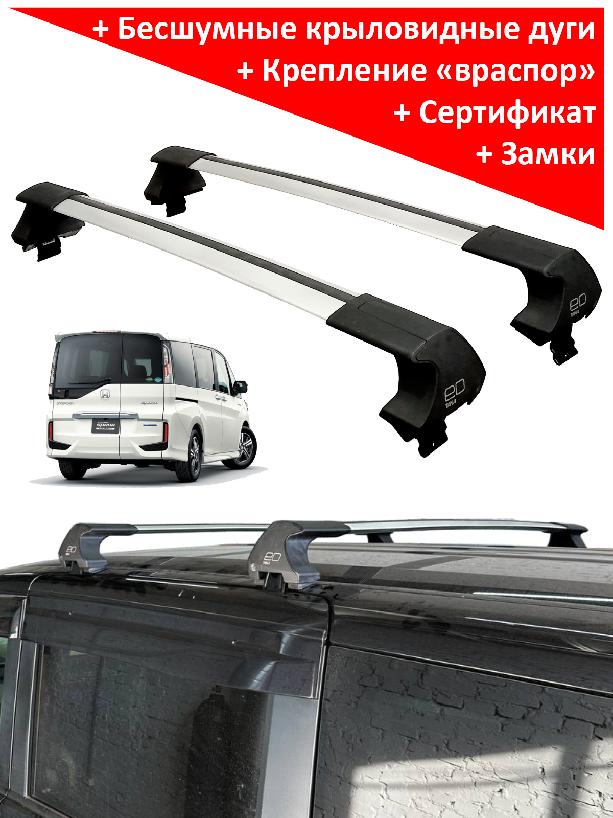 Бесшумная багажная система ED Tana (враспор, без вылетов) на крышу Honda Stepwgn (4G) / Honda Stepwgn Spada, 2017-2021, производство - ED (Россия). Серебристые дуги. Крепление за дверной проём (в штатные места).