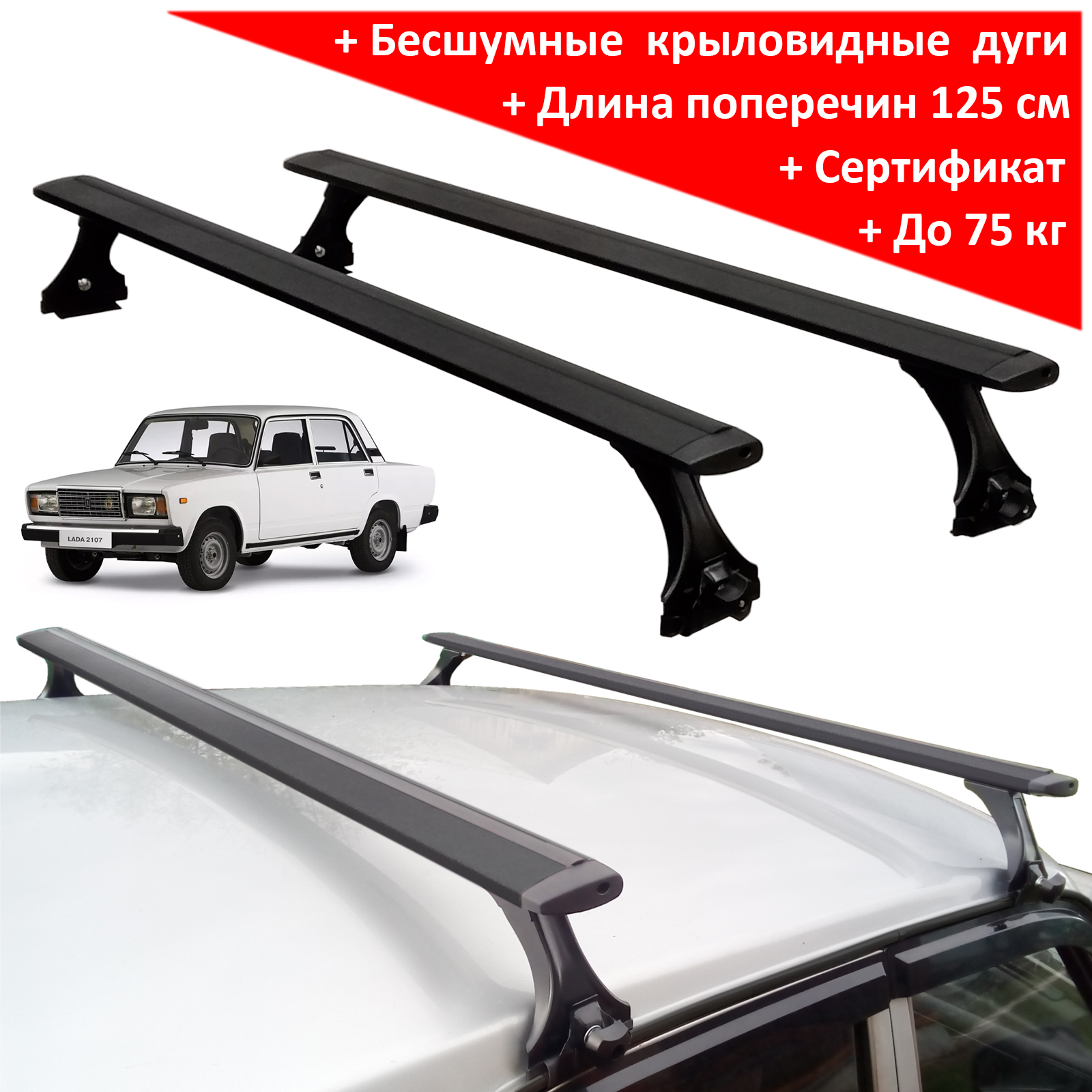 Багажник на крышу ВАЗ 2101-07, производство - Delta (Россия), с аэродинамическими (крыловидными) дугами черного цвета, крепление на водостоки. Грузоподъёмность до 75 кг.