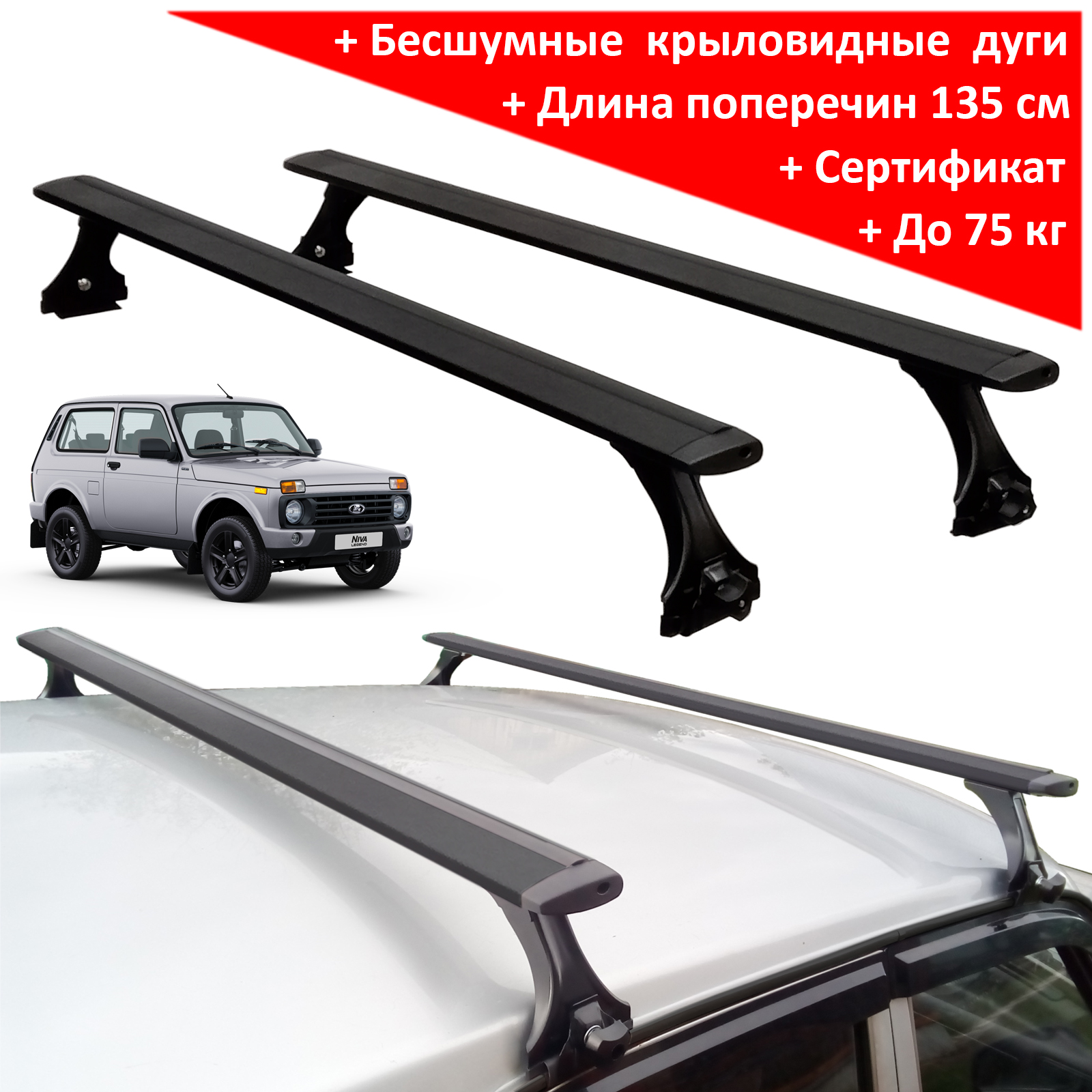 Багажник на крышу ВАЗ-2121, ВАЗ-2131 (Нива / Нива Urban), производство - Delta (Россия), с аэродинамическими (крыловидными) дугами черного цвета, крепление на водостоки. Грузоподъёмность до 75 кг.