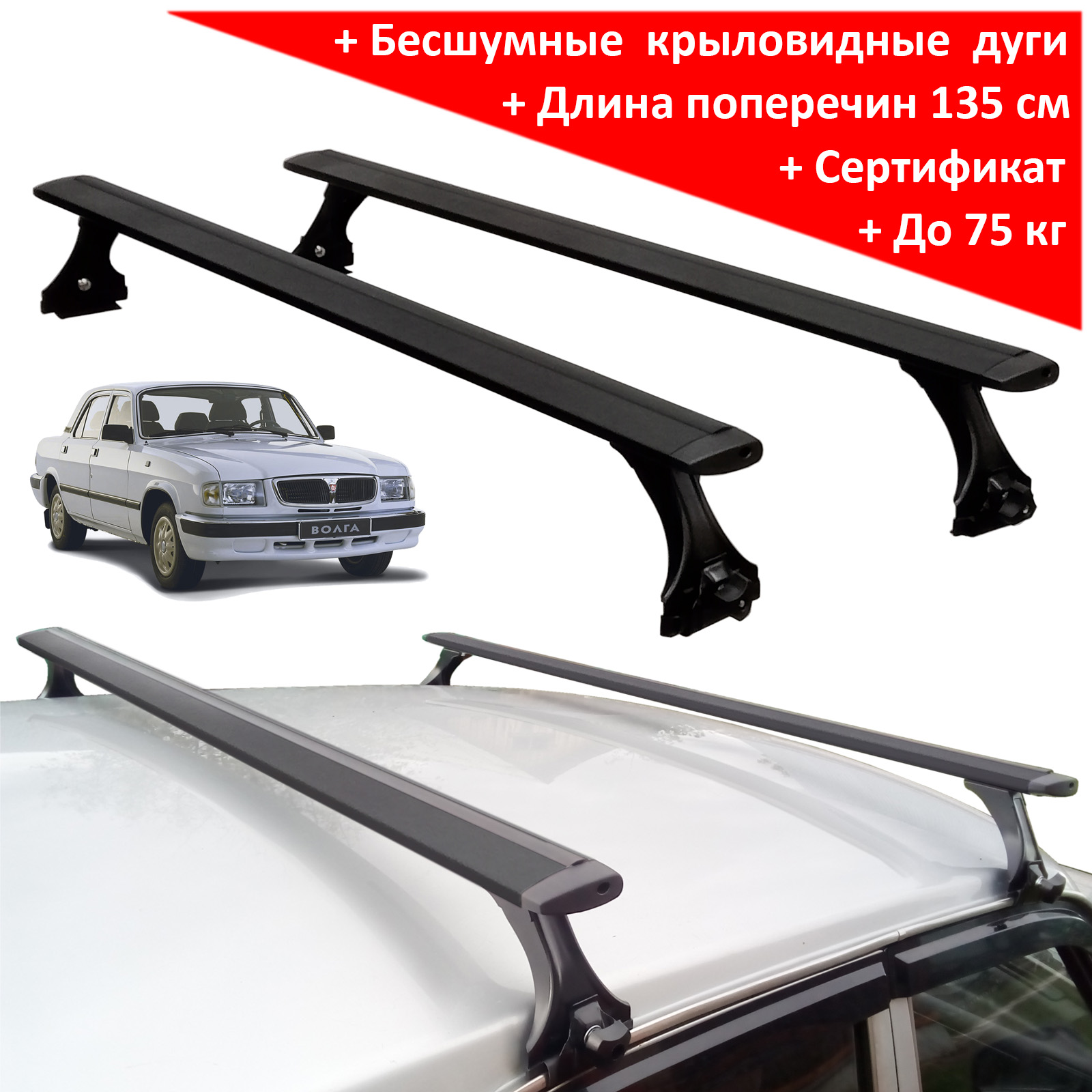 Багажник на крышу ГАЗ 3110 (Волга), производство - Delta (Россия), с аэродинамическими (крыловидными) дугами черного цвета, крепление на водостоки. Грузоподъёмность до 75 кг.