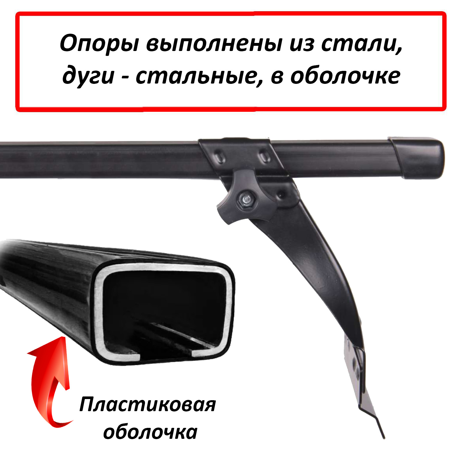 Багажник состоит из стальной опоры и прямоугольного стального профиля 20x30 мм. Длина дуги составляет 1200 мм, каждая дуга покрыта сверху пластиковой оболочкой черного цвета. На торцах дуг расположены пластиковые заглушки. Крепление на крышу производится при помощи комплекта болтов в штатные отверстия, скрытые резиновой прокладкой над дверным проемом автомобиля.