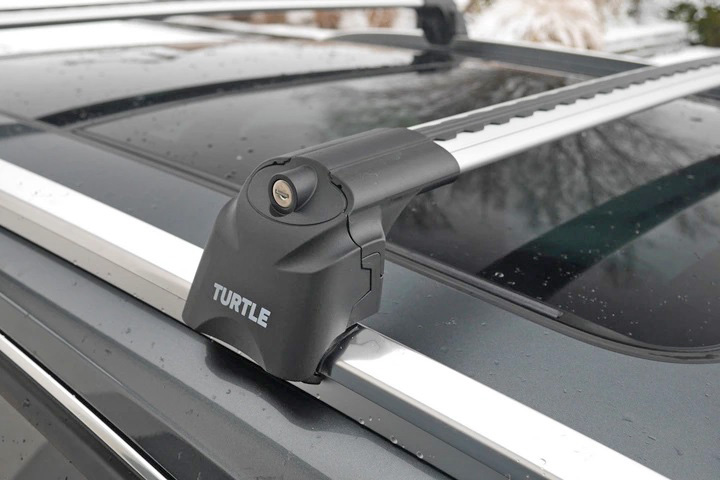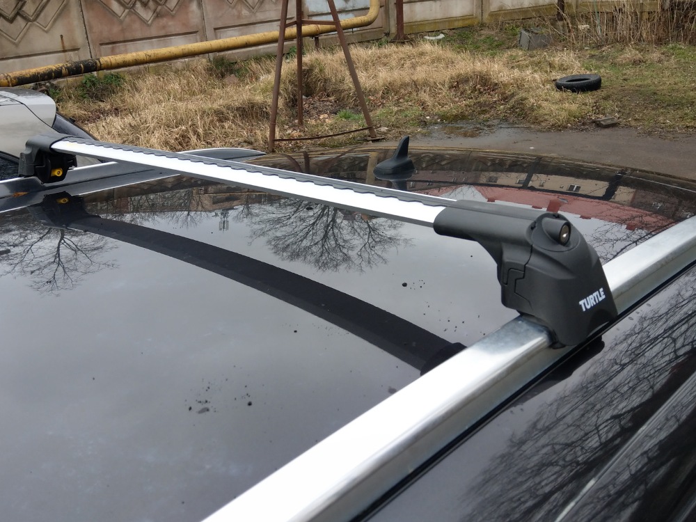 Багажник на интегрированные рейлинги Turtle Air 2 (Турция), без вылетов, с аэродинамическими дугами серебристого цвета. Грузоподъемность - до 75 кг.