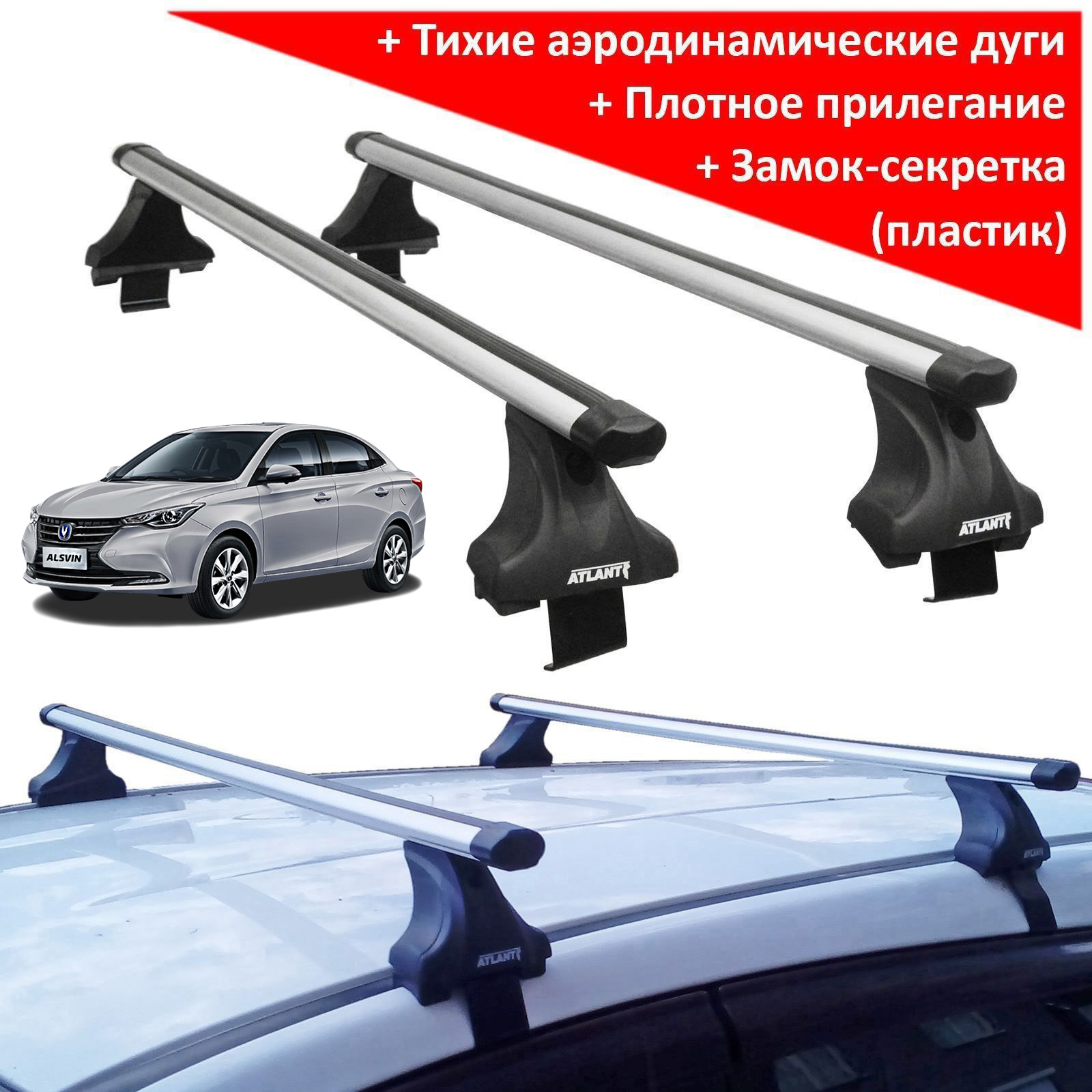 Багажник на крышу Changan Alsvin (седан, 2018-…), Атлант, аэродинамические дуги Эконом, опора Е