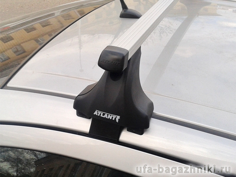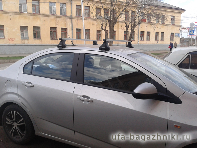 Автобагажник на крышу Chevrolet Aveo(T300) (4-dr sedan, 5-dr hatchback) 2011г.-..., Атлант (Россия), с прямоугольными дугами и опорами типа E. Крепление за дверной проем. Грузоподъемность до 75 кг (до 100 кг распределенной нагрузки)