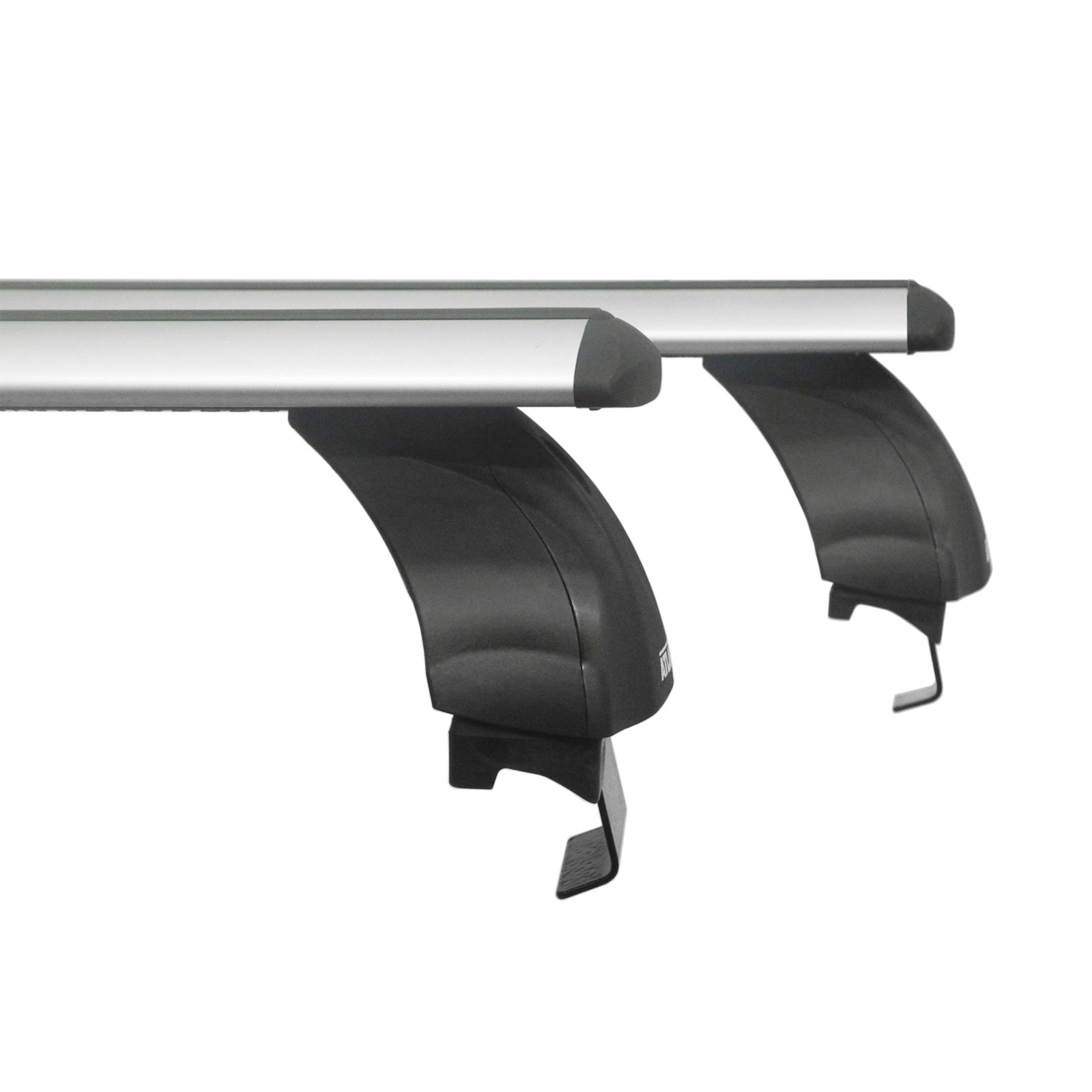 В основе багажной системы находятся 2 поперечные дуги крыловидной формы, изготовленные из алюминиевого профиля, серебристо-серого цвета, длиной 1100 мм. Ширина дуг составляет 8 см, на концах располагаются черные пластиковые заглушки. Дуги имеют дополнительный функционал, в них закрепляются аксессуары: лыжные насадки, велокрепления, грузовые фиксаторы – для этого служит специальный Т-образный слот, расположенный в верхней части дуги. В свободном состоянии Т-слот закрывается резиновым уплотнителем. Толщина стенок дуги составляет 2 мм, есть также внутренние ребра жесткости, обеспечивающие надежность и прочность конструкции.