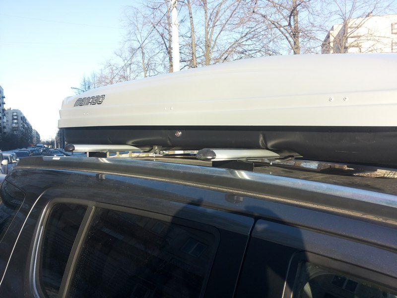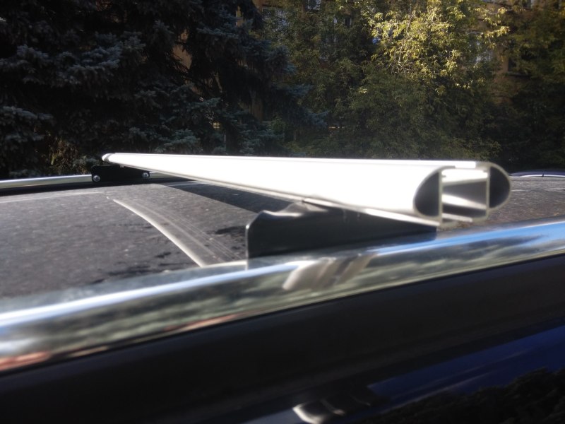 В основе багажника - 2 прочные алюминиевые дуги, выполненные из аэродинамического профиля, длиной 1260 мм. Сверху дуг проходит Т-образный паз, предназначенный для установки дополнительного оборудования - велокреплений или лыжных насадок. Фиксация дуг на рейлингах осуществляется при помощи опорных металлических планок, каждая из которых крепится 2 винтами в штатные места, расположенные с внутренней стороны рейлингов автомобиля.