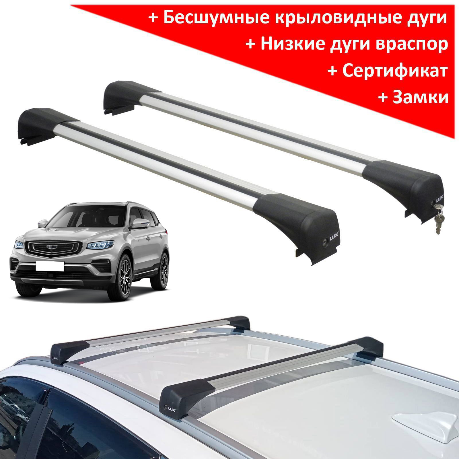 Багажник на крышу Geely Atlas 2017-..., Lux Bridge, крыловидные дуги (серебристый цвет)