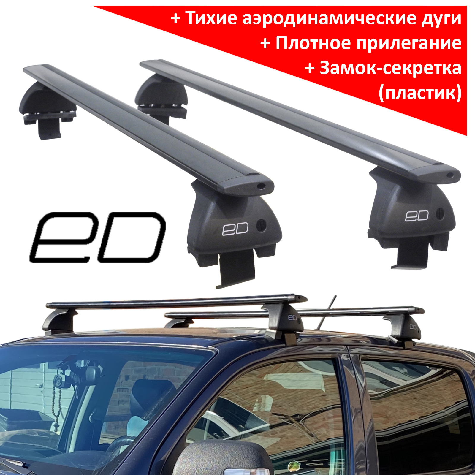 Багажная система ЕД - это простая, но надежная конструкция, состоящая из трех основных частей: дуг, опор и адаптеров. Профиль дуги - крыловидный (ширина 80 мм), материал - анодированный алюминий, цвет - черный, длина 1350 мм. Поверх дуги проходит Т-образный профиль, предназначение которого - легкая и быстрая установка дополнительного оборудования - велокреплений, лыжный насадок. В свободном состоянии Т-профиль закрывается черным резиновым уплотнителем. На концах дуг располагается пара заглушек. Дуги опираются на 4 стойки, производимые из прочного пластика. Крышки плотно закрываются на пластиковый замок (Дополнительная опция - металлические замки). Фиксация на крыше производится с помощью системы адаптеров за дверной проём.