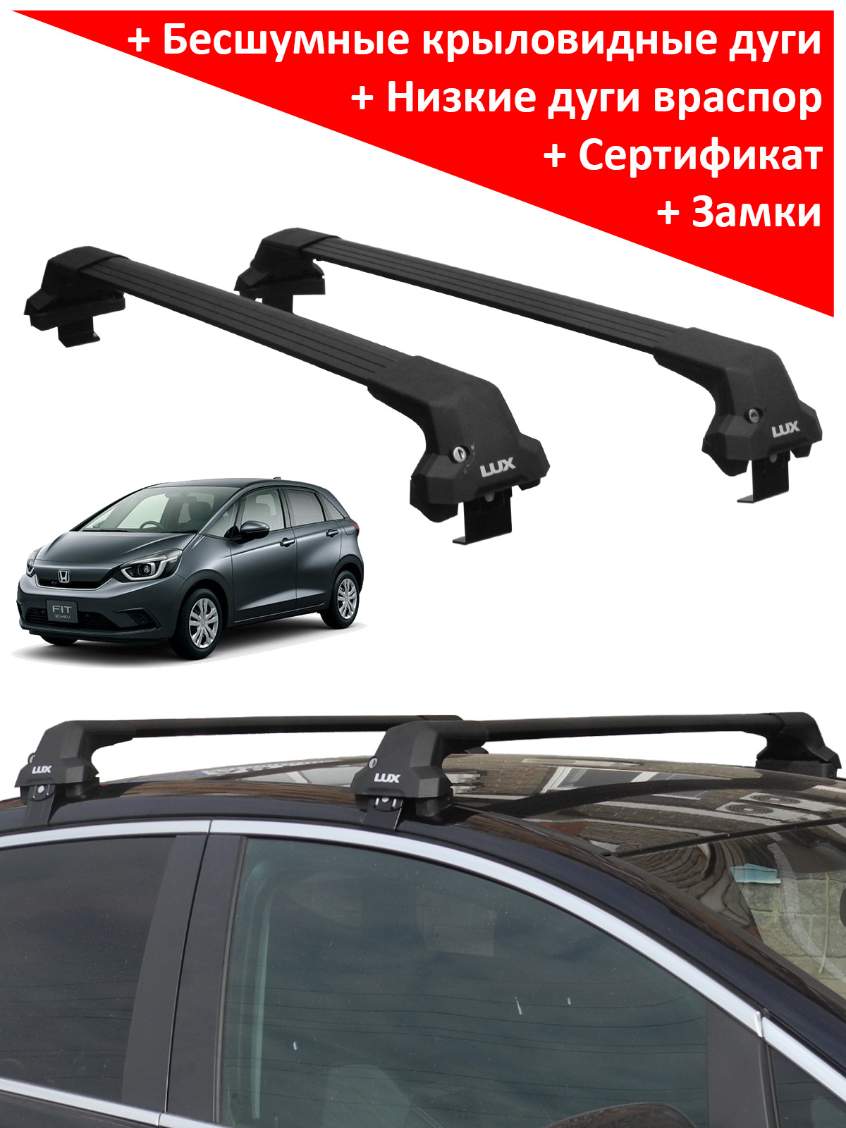 Багажная система Lux City для Honda Fit IV (хэтчбек, 2020-...) (враспор, без вылетов), производство - Lux (Россия, Москва). Черные дуги. Грузоподъемность до 75 кг