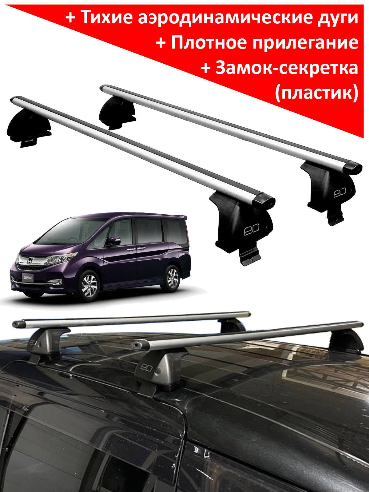 Автобагажник на крышу автомобиля Honda Stepwgn (4G) (2017-2021) - ED (Россия), аэродинамические дуги. Грузоподъемность до 75 кг.