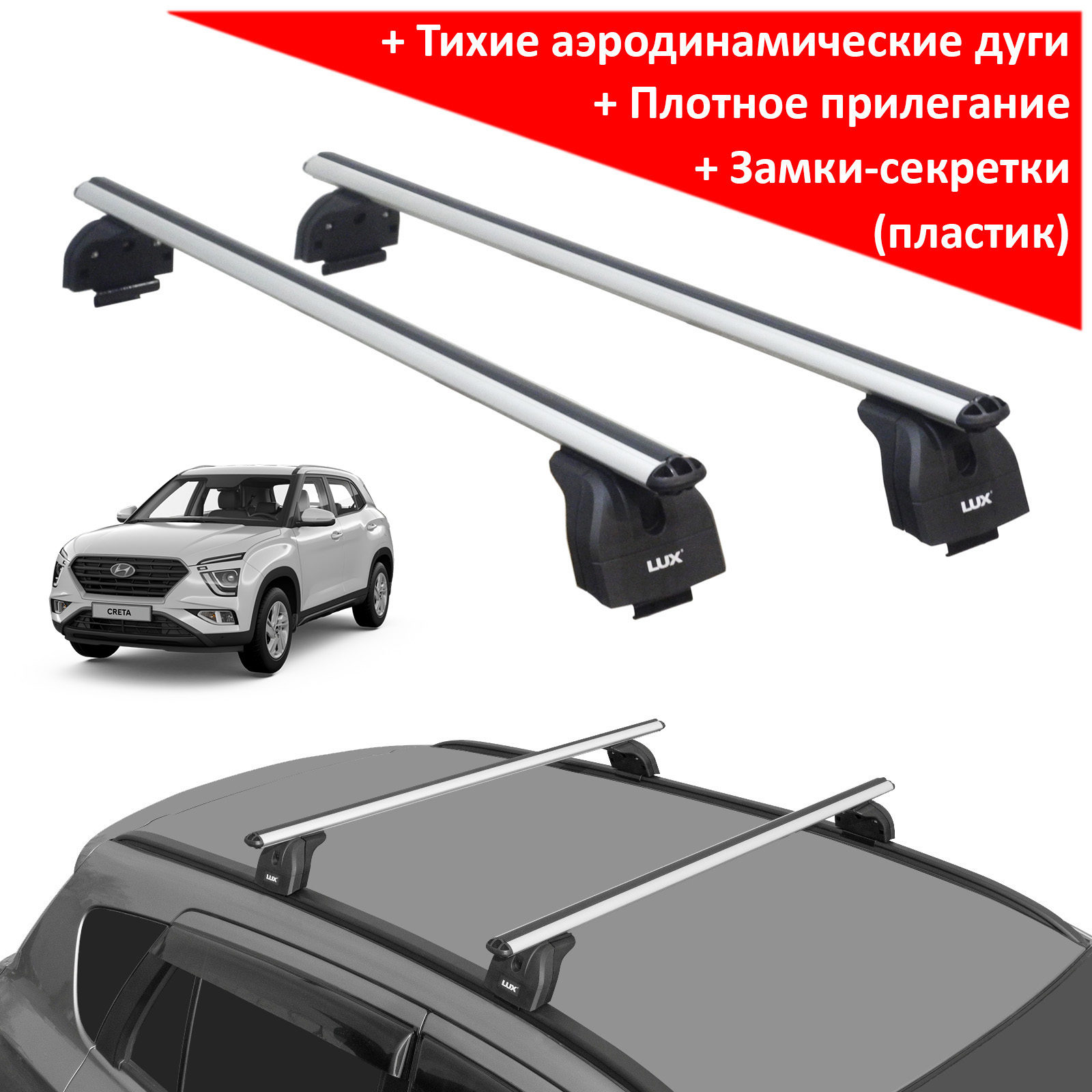 Багажник на крышу Hyundai Creta 2021-..., Lux, аэродинамические дуги (53 мм) на интегрированные рейлинги