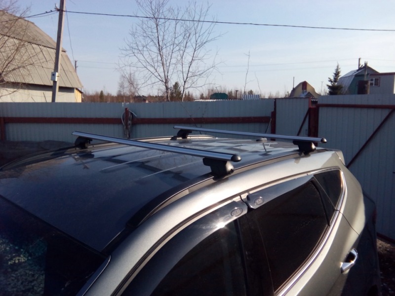Если ваш автомобиль имеет интегрированные рейлинги (без просвета), то для перевозки габаритных грузов вам необходимо установить специальный багажник с надежным креплением на рейлинги. Отличный вариант - багажник на крышу Hyundai Santa Fe с аэродинамическими дугами от российского производителя - компании Атлант. Грузоподъемность - до 75 кг, при этом сами дуги выдерживают до 120 кг распределенной нагрузки.