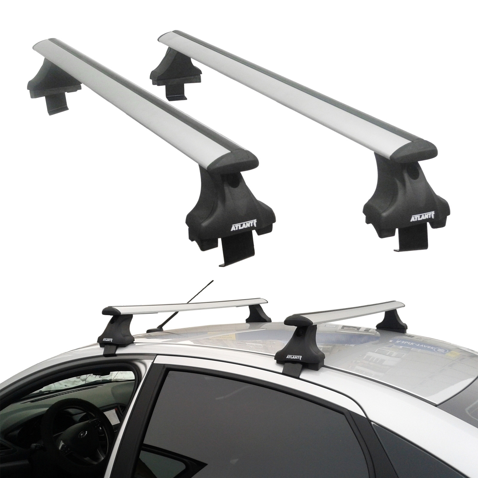 Автобагажник на крышу Hyundai Solaris 2011-17, sedan, Атлант (Россия), с крыловидными аэродугами и аэродинамическими опорами типа E. Грузоподъемность до 75 кг (до 120 кг распределенной нагрузки)
