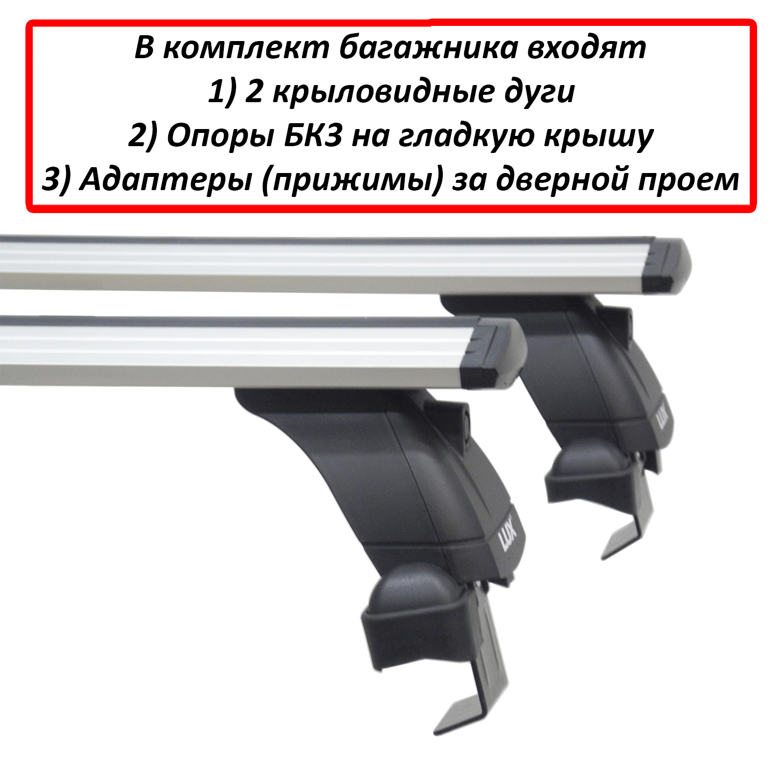Багажная система Lux - это простая, но надежная конструкция, состоящая из трех основных частей: дуг, опор и адаптеров. Профиль дуги - аэродинамический, крыловидный, материал - анодированный алюминий, цвет - серебристый, длина 1200 мм, ширина - 82 мм. Поверх дуги проходит Т-образный профиль, предназначение которого - легкая и быстрая установка дополнительного оборудования - велокреплений, лыжный насадок. В свободном состоянии Т-профиль закрывается черным резиновым уплотнителем. На концах дуг располагается пара оригинальных заглушек, имеющих отодвигающийся лючок для доступа к Т-профилю. Дуги опираются на 4 стойки, производимые из прочного пластика. Опоры могут быть снабжены металлическими замками Lux (дополнительная опция). Фиксация на крыше производится с помощью системы адаптеров за дверной проём.