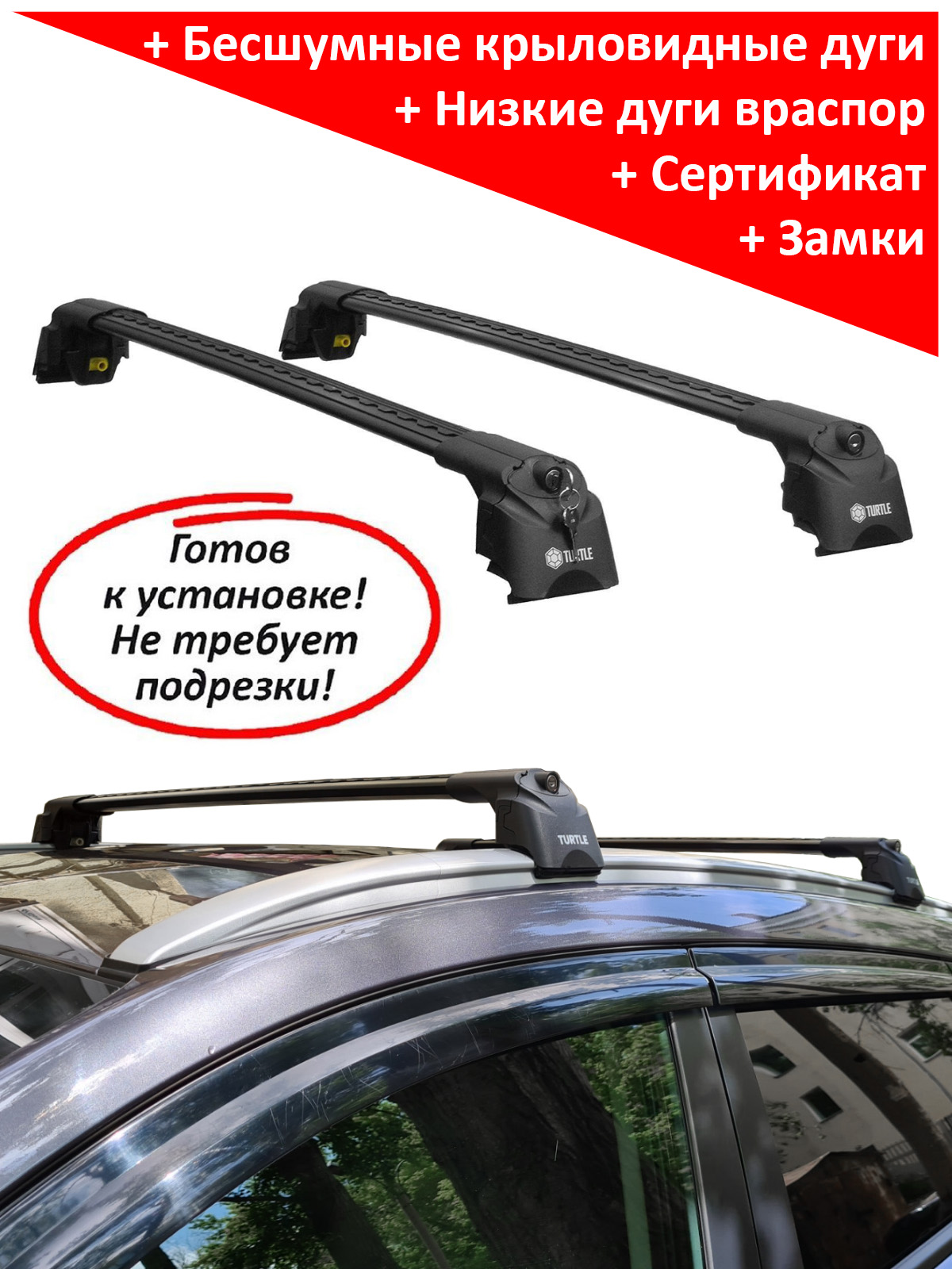 Универсальный багажник на интегрированные рейлинги Turtle Air 2 (Турция), без вылетов, с аэродинамическими дугами черного цвета. Грузоподъемность - до 75 кг.