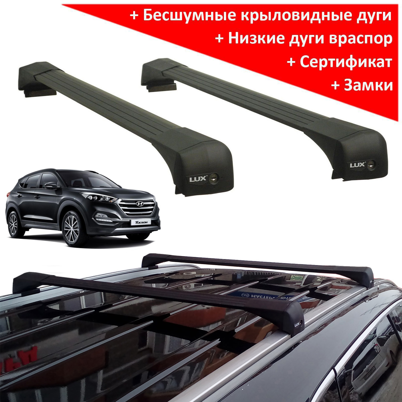 Бесшумная багажная система Lux Bridge для Hyundai Tucson TL (2015-2021) (враспор, без вылетов), производство - Lux (Россия, Москва). Черные дуги. Грузоподъемность до 75 кг