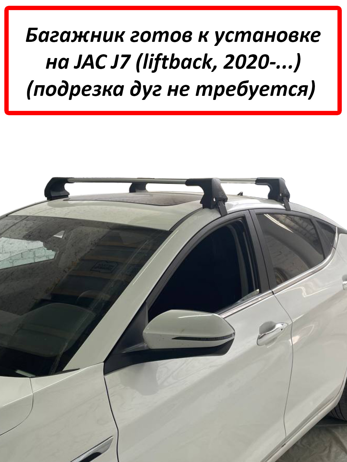 Бесшумная багажная система ED Tana (враспор, без вылетов) на крышу JAC J7 (5-dr liftback, 2020-...), производство - ED (Россия). Серебристые дуги. Крепление за дверной проём.