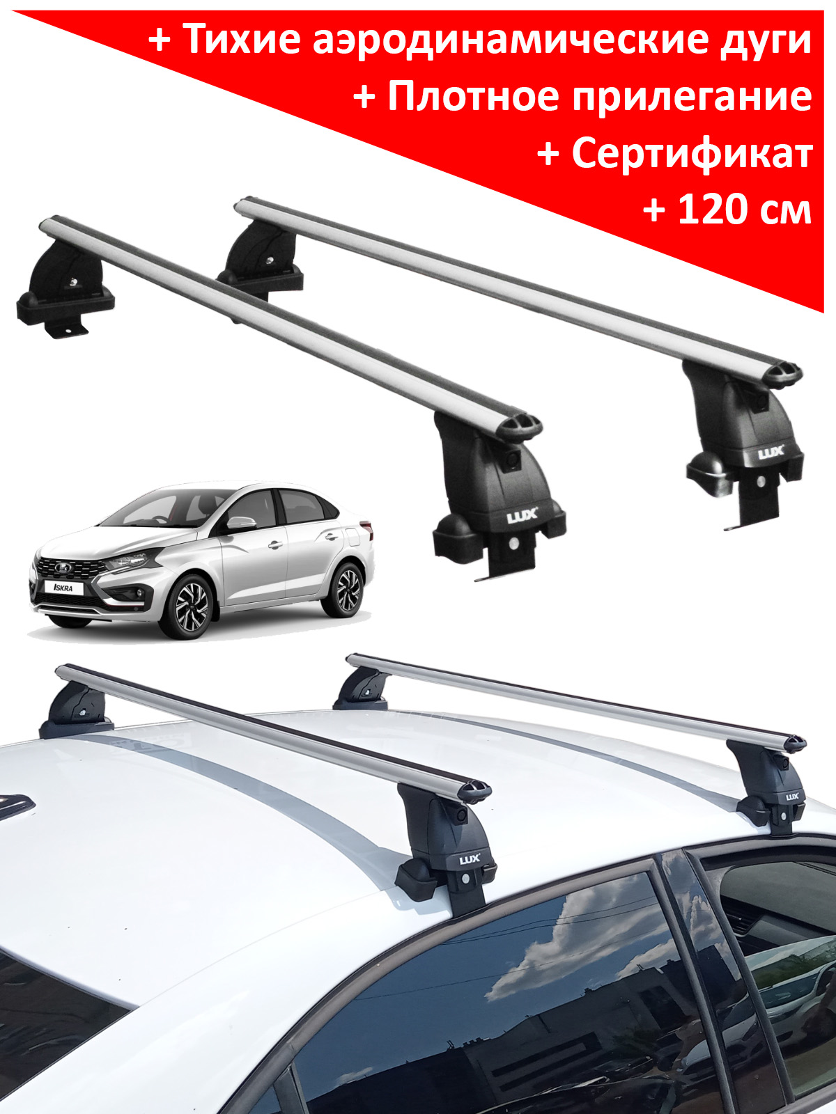 Багажная система Lux - это простая, но надежная конструкция, состоящая из трех основных частей: дуг, опор и адаптеров. Профиль дуги - аэродинамический, материал - анодированный алюминий, цвет - серебристый, длина 1200 мм, ширина - 53 мм. Поверх дуги проходит Т-образный профиль, предназначение которого - легкая и быстрая установка дополнительного оборудования - велокреплений, лыжный насадок. В свободном состоянии Т-профиль закрывается черным резиновым уплотнителем. На концах дуг располагается пара заглушек. Дуги опираются на 4 стойки, производимые из прочного пластика. Фиксация на крыше производится с помощью системы адаптеров за дверной проём, при этом используются штатные отверстия - для них в комплекте имеется набор винтов.