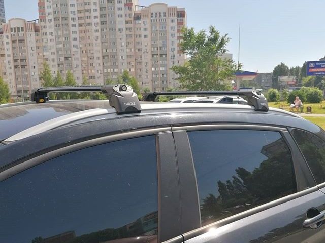 Багажник на интегрированные рейлинги Turtle Air 2 (Турция), без вылетов, с аэродинамическими дугами черного цвета. Грузоподъемность - до 75 кг.