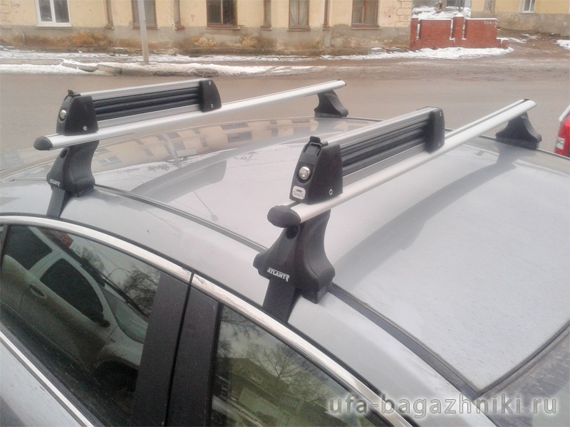 Автобагажник на крышу Mazda 6 (2013г.-...), sedan, Атлант (Россия), с аэродинамическими дугами и опорами типа E. Крепление за дверной проем. Грузоподъемность до 75 кг (до 120 кг распределенной нагрузки)