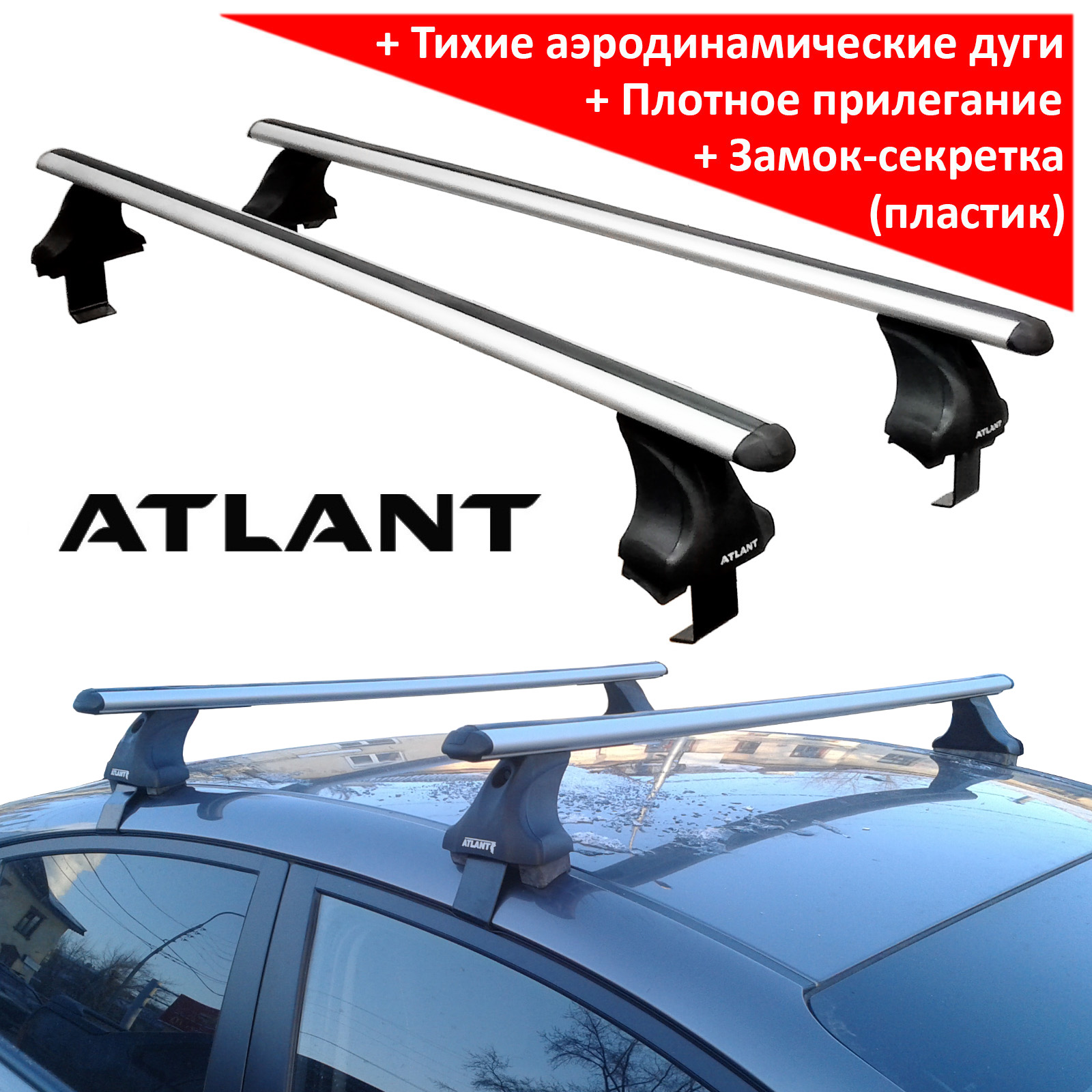 Багажник на крышу Mitsubishi Lancer 10 sedan, Атлант: аэродинамические дуги и опоры типа Е