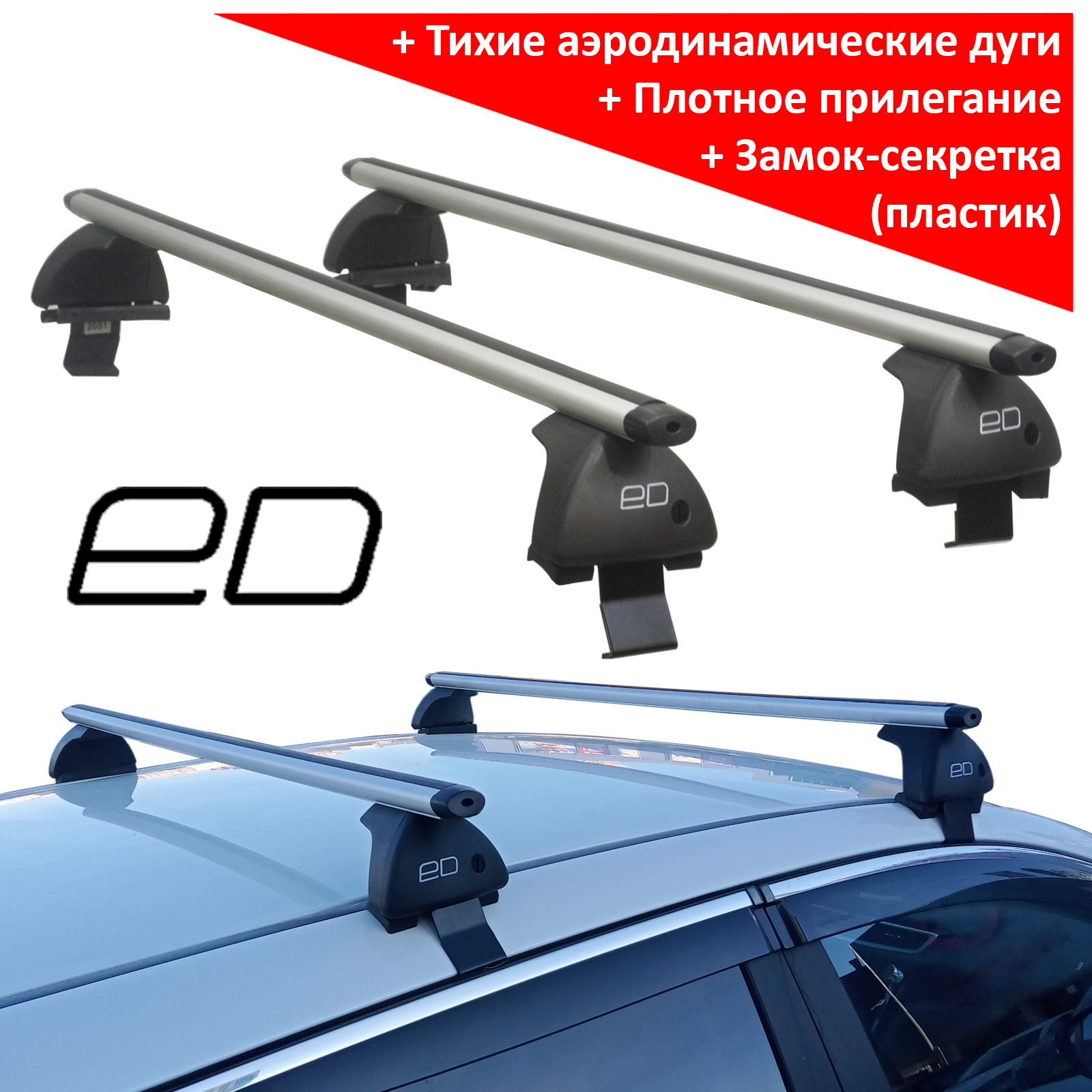 Багажная система ЕД - это простая, но надежная конструкция, состоящая из трех основных частей: дуг, опор и адаптеров. Профиль дуги - аэродинамический, материал - анодированный алюминий, цвет - серебристый, длина 1250 мм. Поверх дуги проходит Т-образный профиль, предназначение которого - легкая и быстрая установка дополнительного оборудования - велокреплений, лыжный насадок. В свободном состоянии Т-профиль закрывается черным резиновым уплотнителем. На концах дуг располагается пара заглушек. Дуги опираются на 4 стойки, производимые из прочного пластика. Крышки плотно закрываются на пластиковый замок (Дополнительная опция - металлические замки). Фиксация на крыше производится с помощью системы адаптеров за дверной проём с использованием штатных отверстий.
