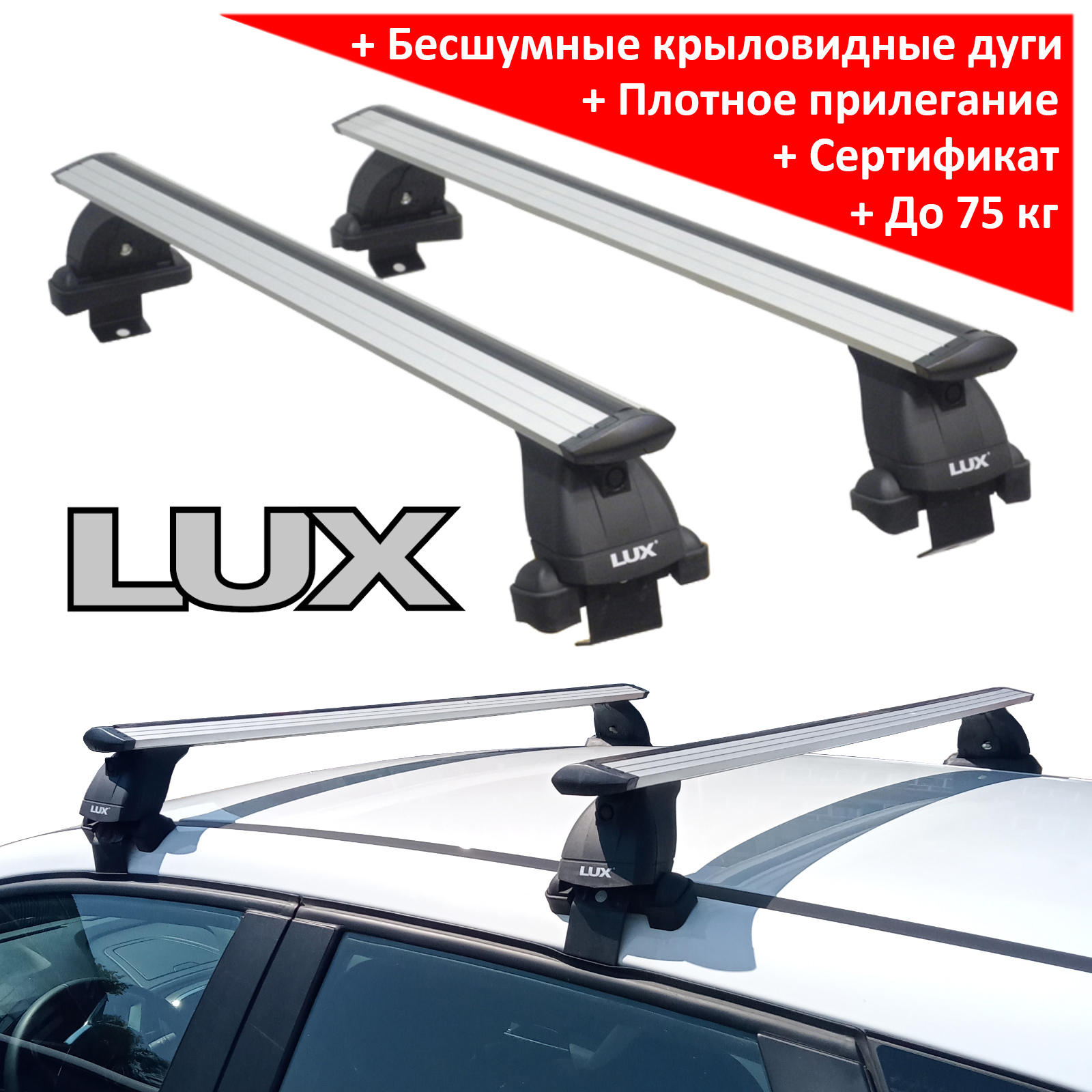 Багажная система Lux - это простая, но надежная конструкция, состоящая из трех основных частей: дуг, опор и адаптеров. Профиль дуги - аэродинамический, крыловидный, материал - анодированный алюминий, цвет - серебристый, длина 1300 мм, ширина - 82 мм. Поверх дуги проходит Т-образный профиль, предназначение которого - легкая и быстрая установка дополнительного оборудования - велокреплений, лыжный насадок. В свободном состоянии Т-профиль закрывается черным резиновым уплотнителем. На концах дуг располагается пара оригинальных заглушек, имеющих отодвигающийся лючок для доступа к Т-профилю. Дуги опираются на 4 стойки, производимые из прочного пластика. В качестве дополнительной опции возможна установка на крышки опор металлических замков Lux. Фиксация на крыше производится с помощью системы адаптеров за дверной проём.