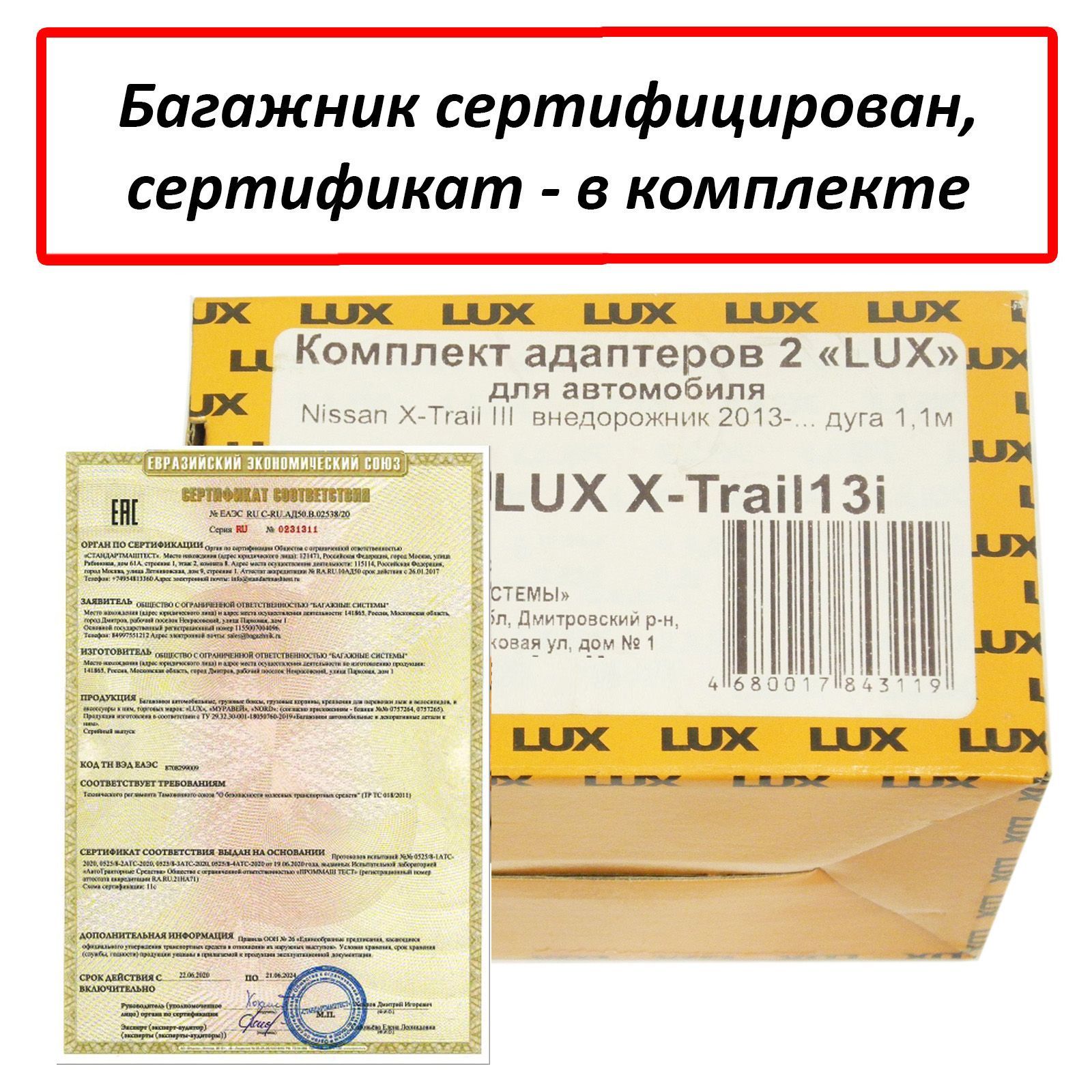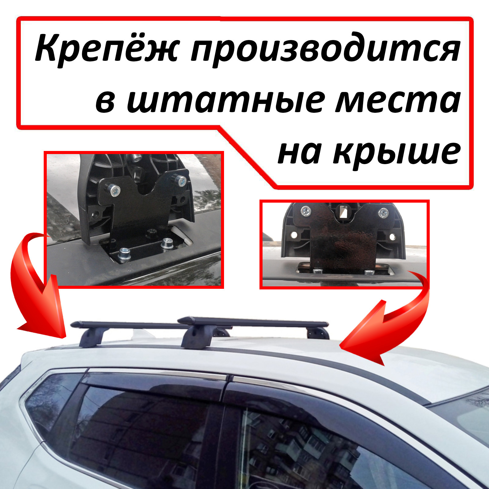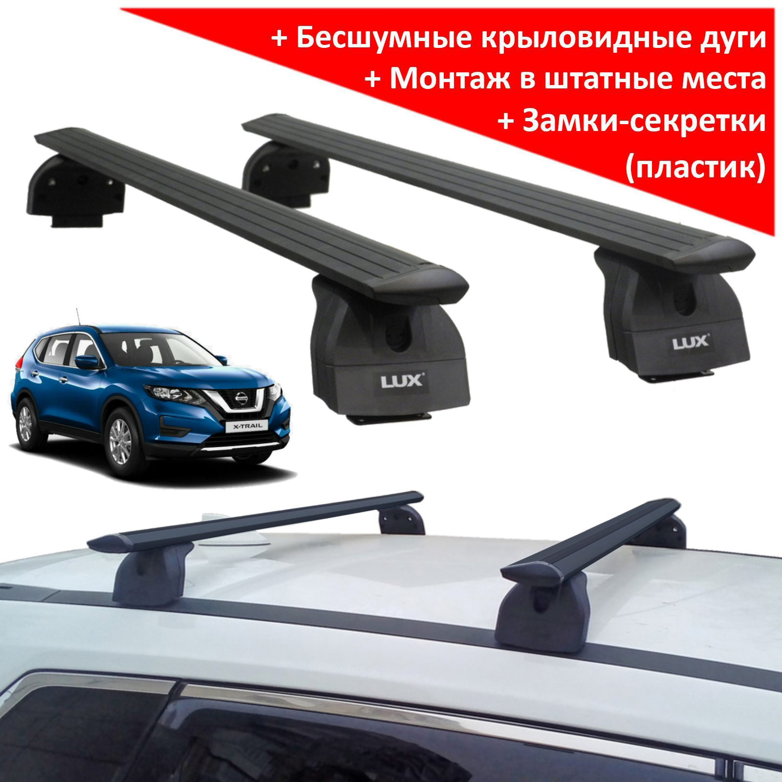 Автомобильный багажник Lux (Россия), крыловидные дуги (аэро-трэвэл 82 мм) черного цвета, установка в штатные места, для Nissan X-Trail T32 (5d SUV 2014-...), без рейлингов, со штатными местами.
