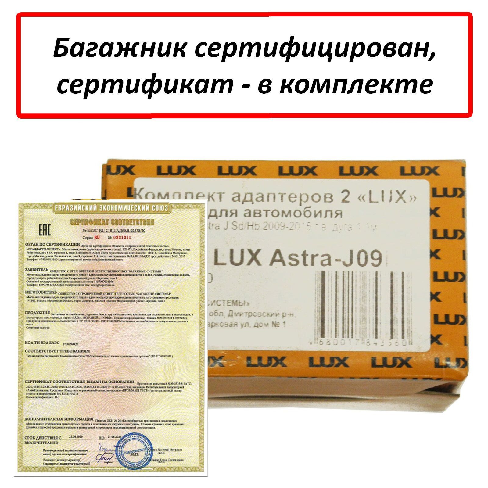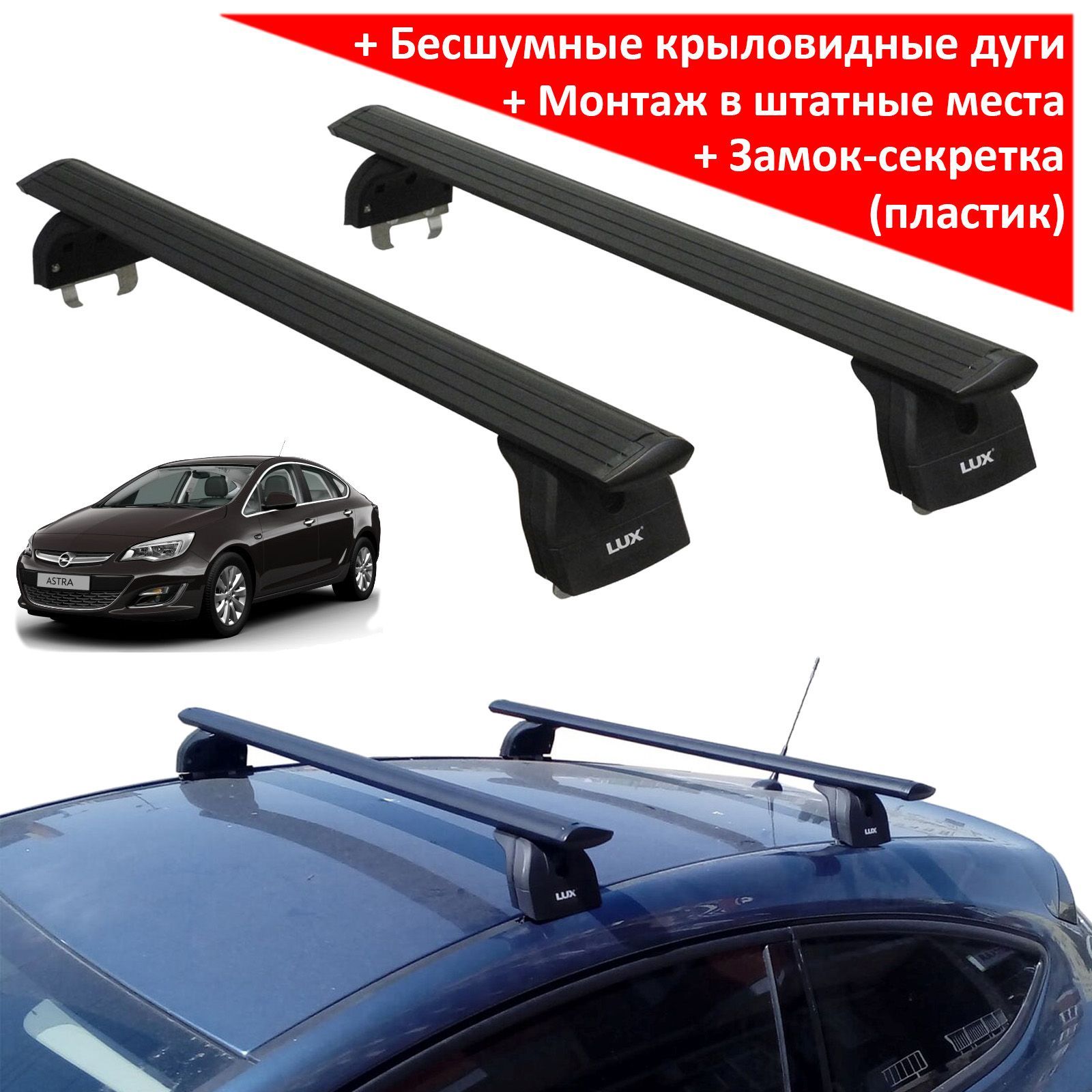 Автомобильный багажник Lux (Россия), крыловидные дуги (аэро-трэвэл 82 мм) черного цвета, установка в штатные места, для Opel Astra J (sedan/hatchback), со штатными местами.