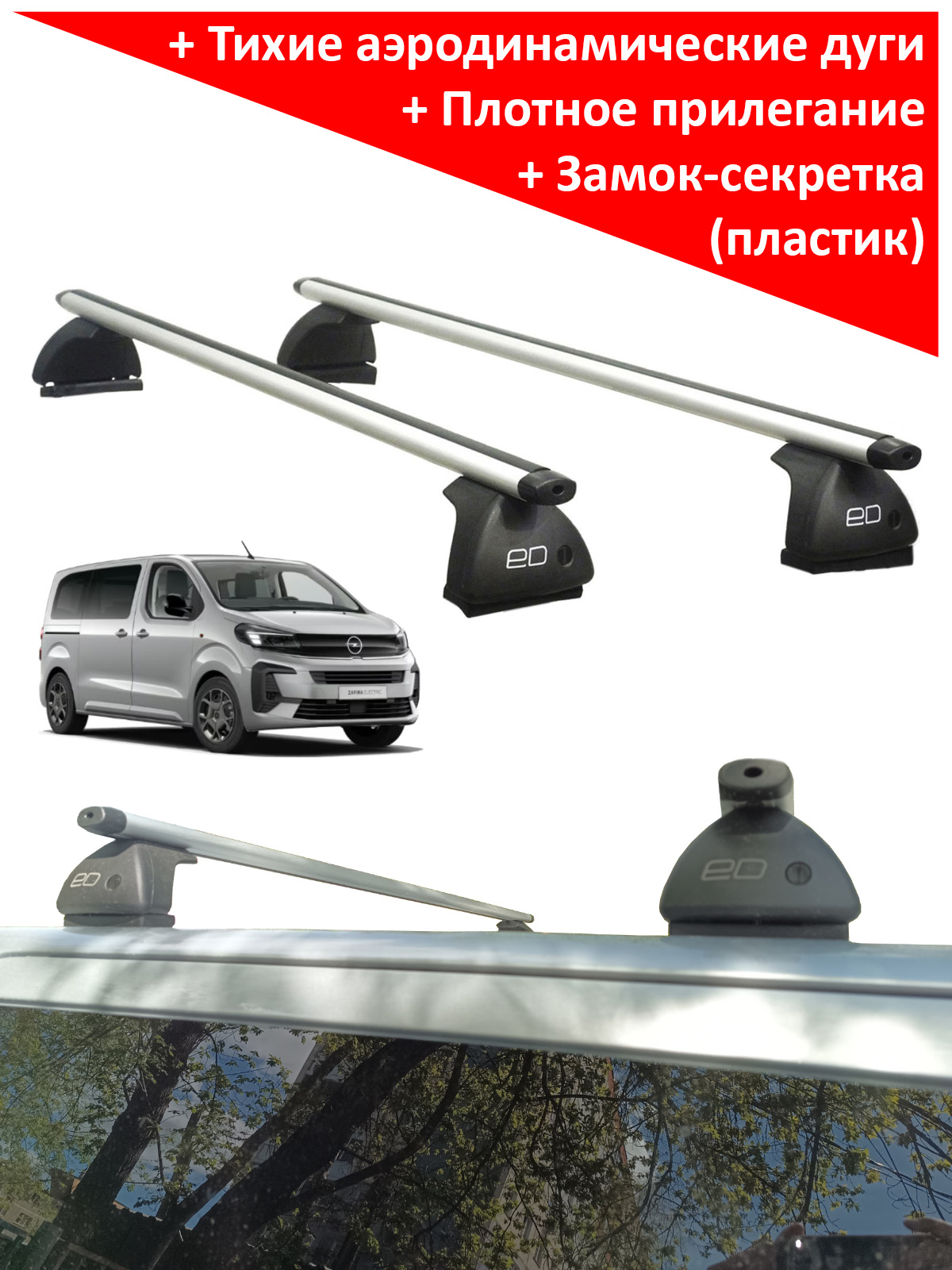 Автобагажник на крышу автомобиля Opel Zafira Life 2020-... - ЕД (Россия), аэродинамические дуги. Крепление в штатные места. Грузоподъемность до 75 кг